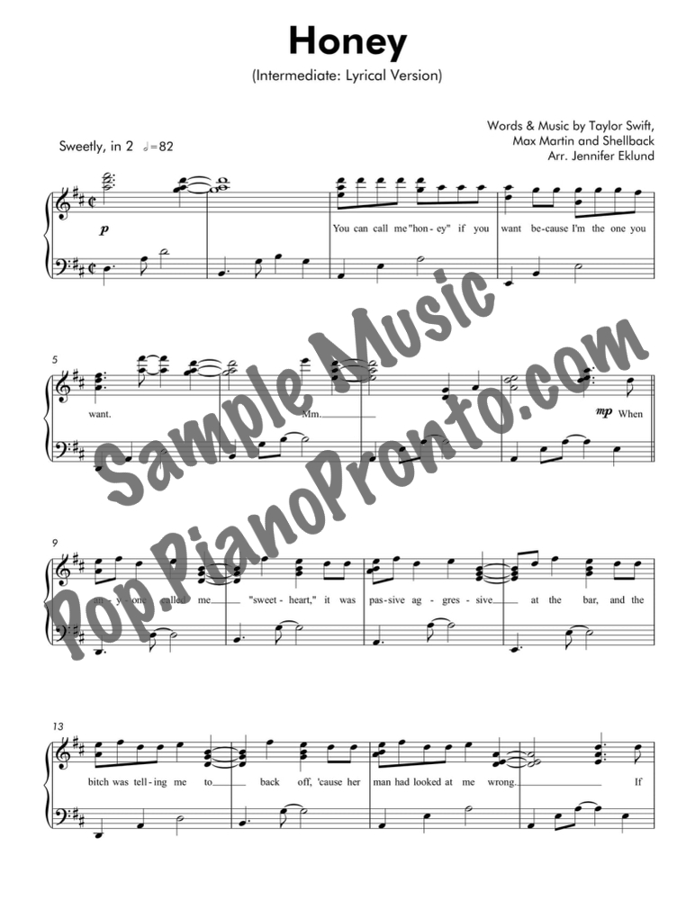 Honey, as performed by Taylor Swift from album "The Life of a Showgirl" set here as a sparkling lyrical piano solo for intermediates by Jennifer Eklund. This version has the vocal range set higher.
