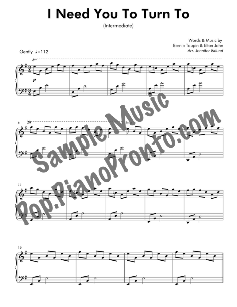 I Need You To Turn To, as performed by Elton John, set here as a sparkling lyrical piano solo for intermediates by Jennifer Eklund.