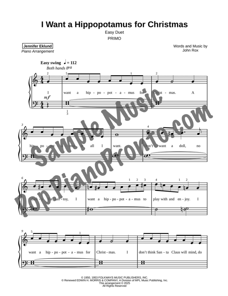 I Want a Hippopotamus for Christmas, a jovial holiday favorite, stylishly arranged as an evenly-leveled piano duet for late beginners and early intermediates by Jennifer Eklund.