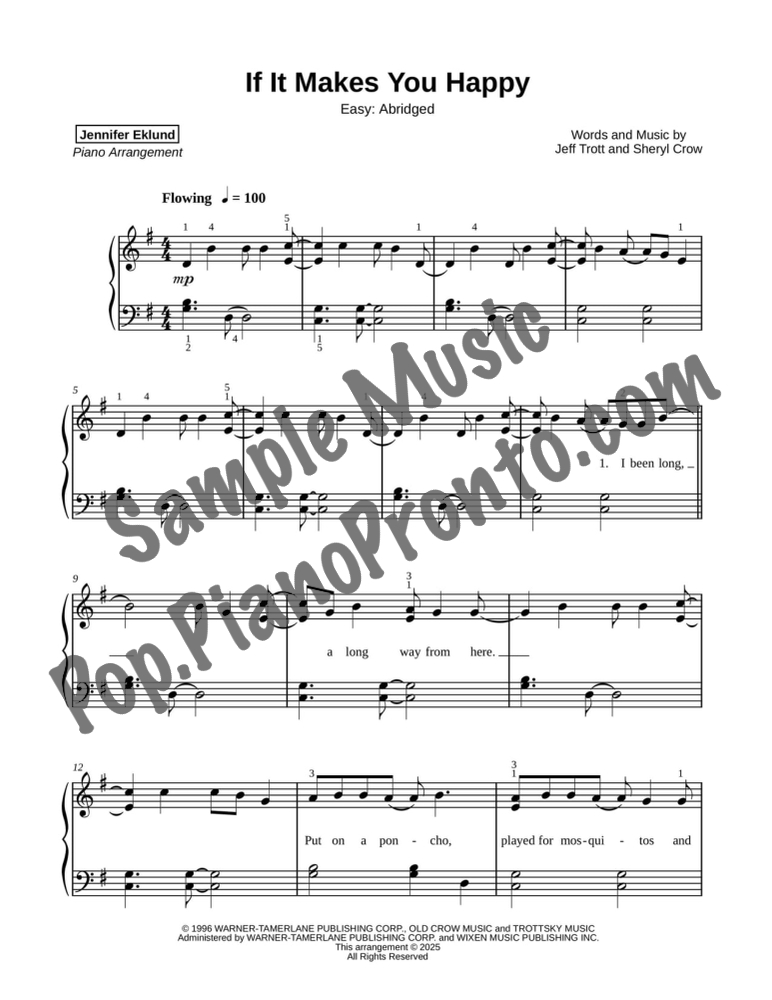 If It Makes You Happy, as performed by Sheryl Crow, stylishly abridged and arranged for easy piano by Jennifer Eklund. This version has a run-time around 3 minutes.
