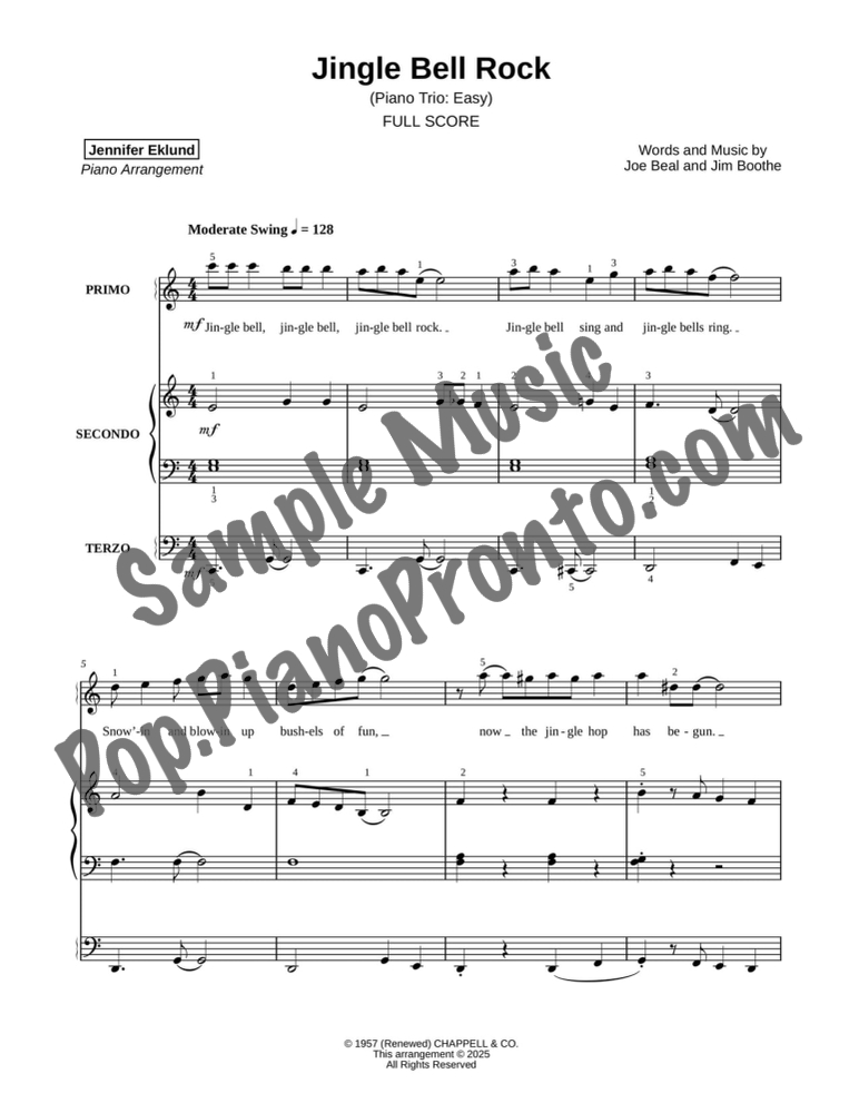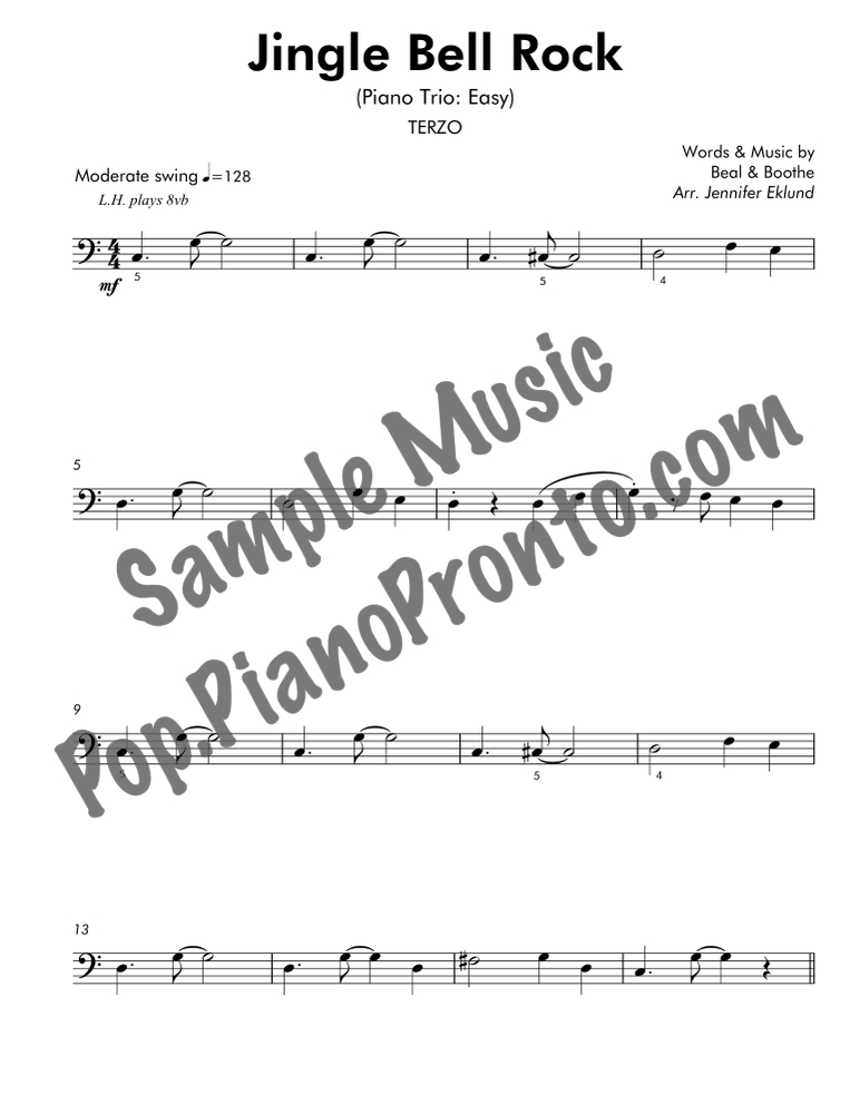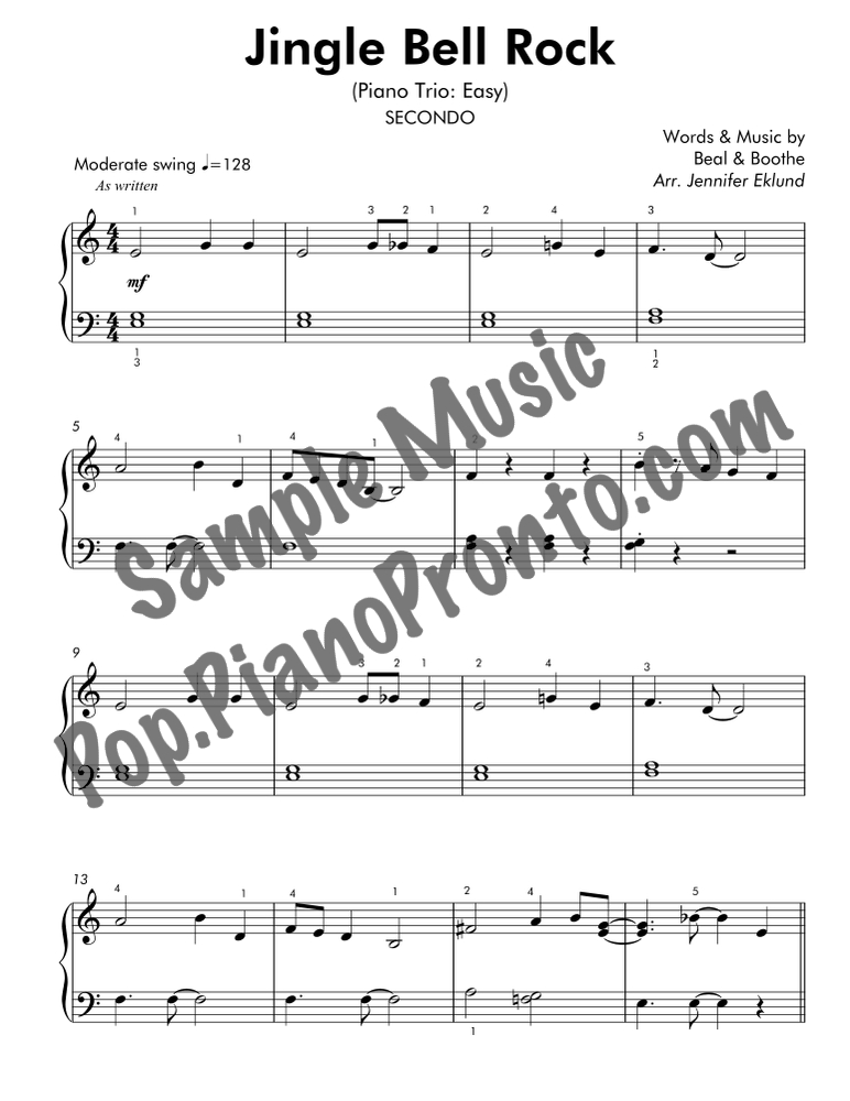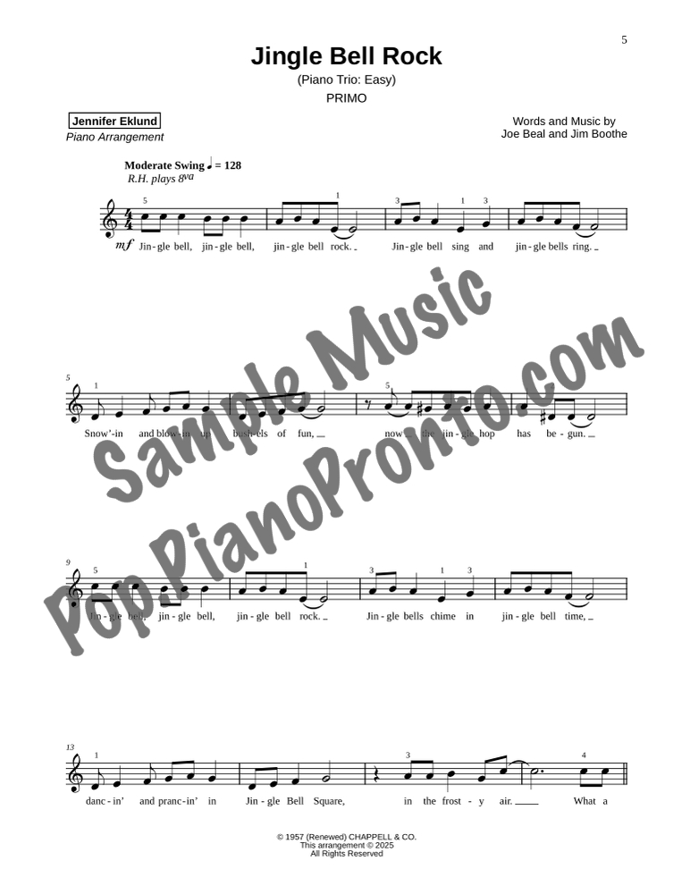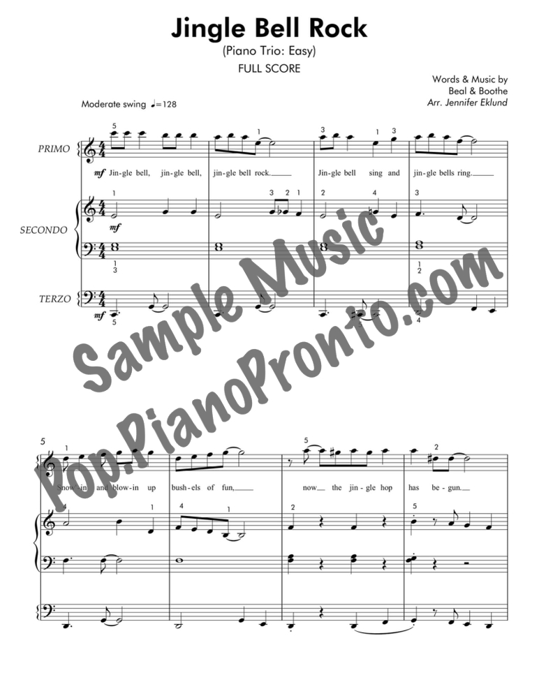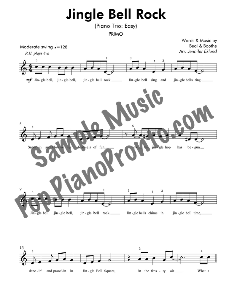 Jingle Bell Rock, a classic holiday favorite, stylishly arranged as an easy trio for late beginners and early intermediates by Jennifer Eklund. This ensemble piece serves as a great introduction to easy collaborative playing and will also be effective in group piano settings with multiple keyboards. Purchase includes separated parts and a full conductors score.