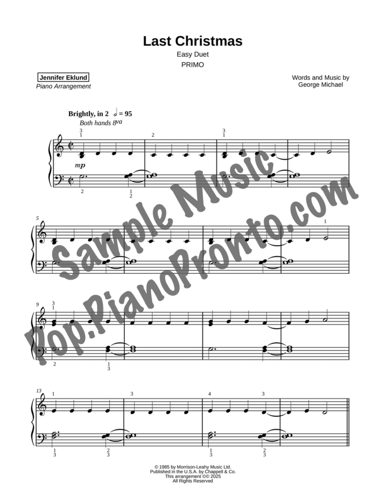 Last Christmas, a timeless holiday favorite performed by George Michael and Wham!, stylishly arranged as an evenly-leveled piano duet for late beginners and early intermediates by Jennifer Eklund.