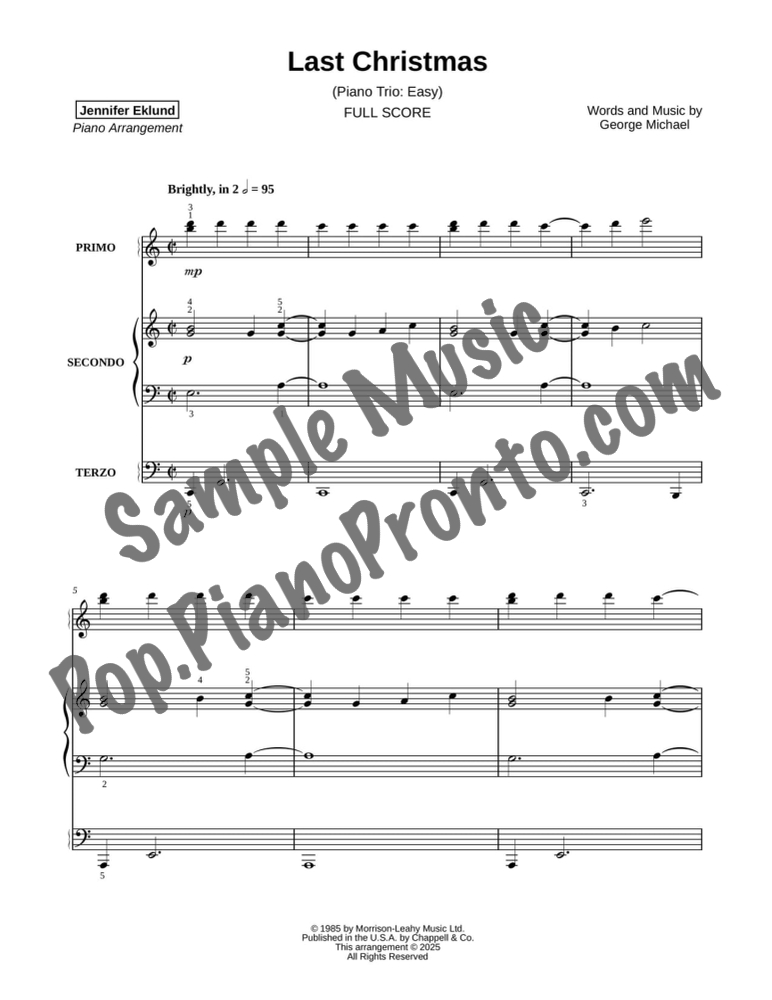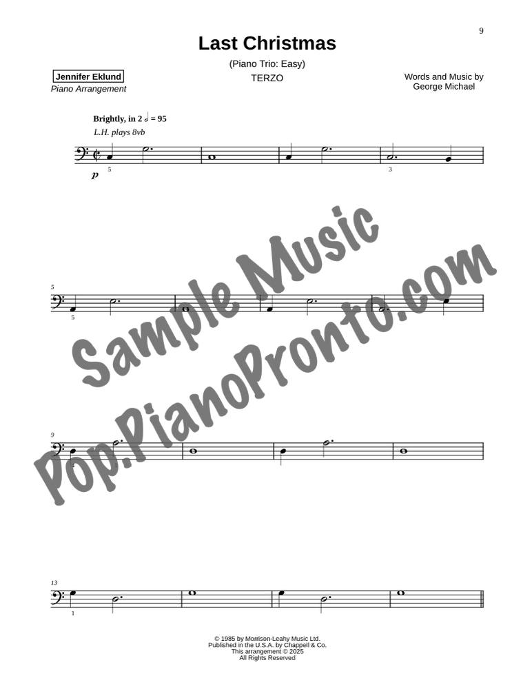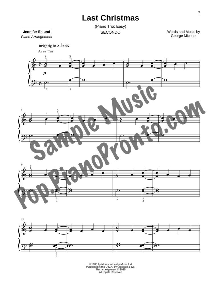 Last Christmas, a pop holiday favorite, stylishly arranged as an easy trio for late beginners and early intermediates by Jennifer Eklund. This ensemble piece serves as a great introduction to easy collaborative playing and will also be effective in group piano settings with multiple keyboards. Purchase includes separated parts and a full conductors score.