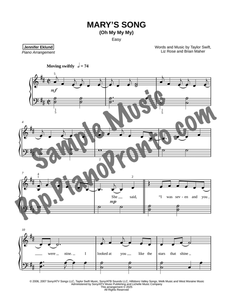 Mary's Song (Oh My My My), as performed by Taylor Swift, stylishly arranged for easy piano by Jennifer Eklund. This is a full version with all sections included and a run-time just under 4 minutes.