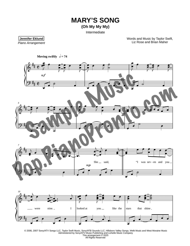 Mary's Song (Oh My My My), as performed by Taylor Swift, in a sparkling lyrical arrangement for intermediate piano solo by Jennifer Eklund. This is a full version with all sections included and a run-time just under 4 minutes.