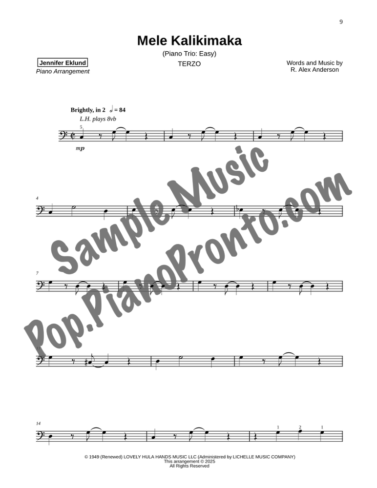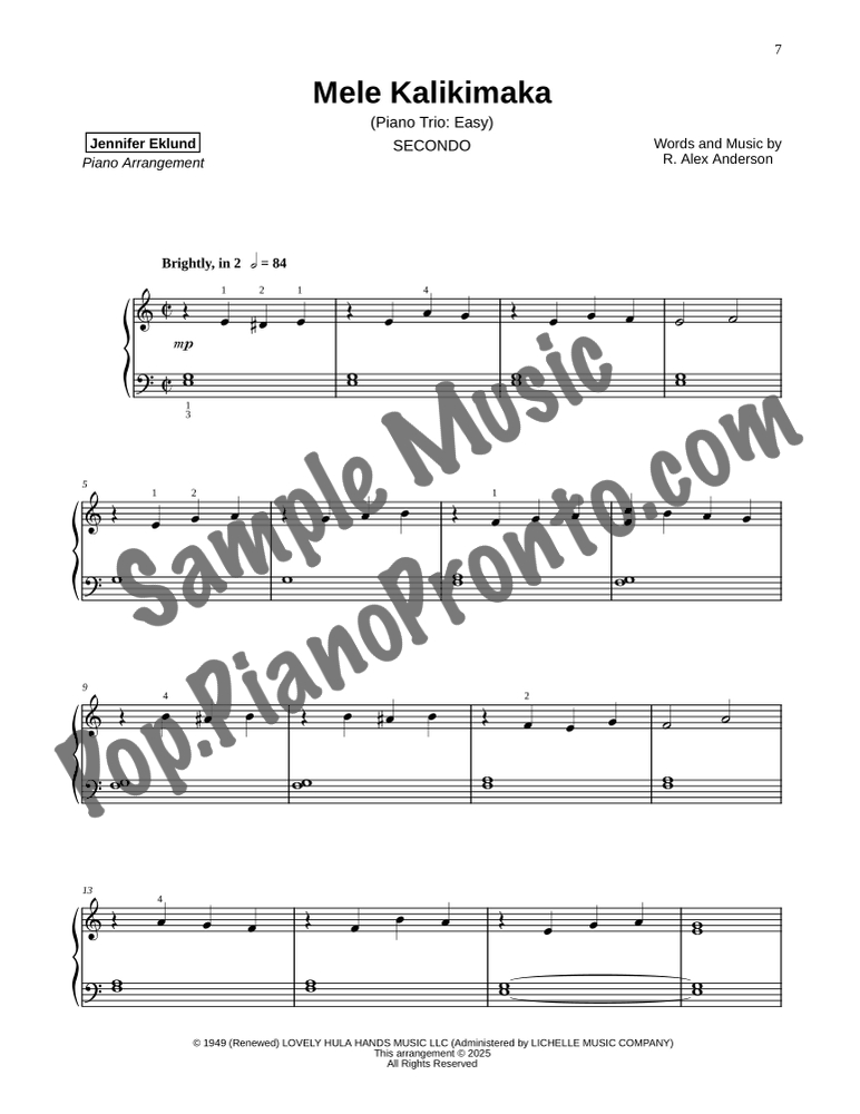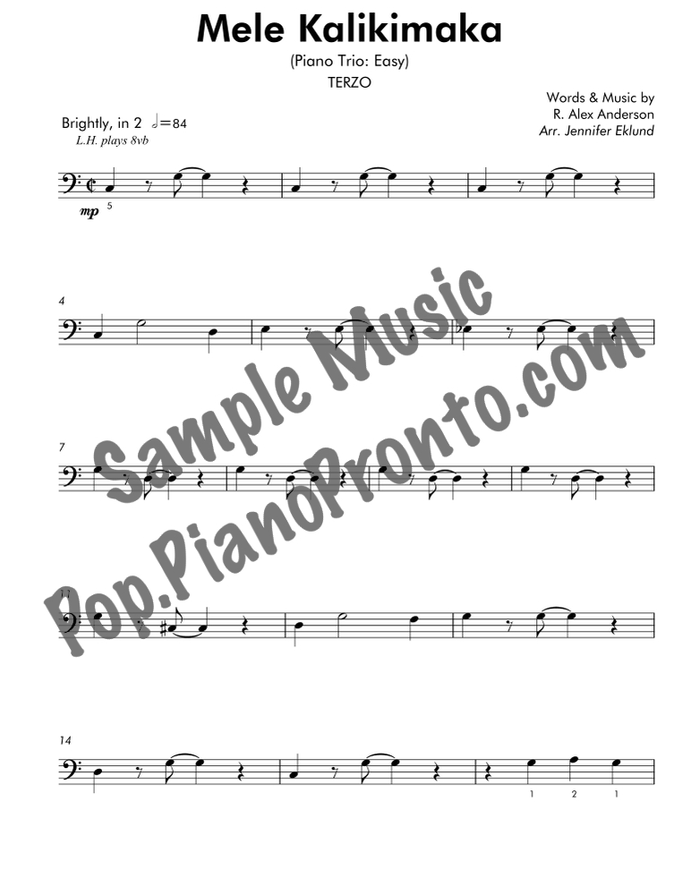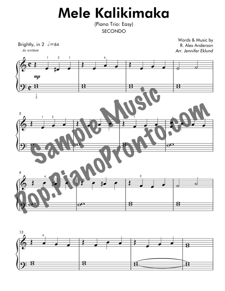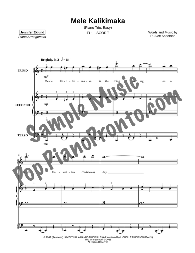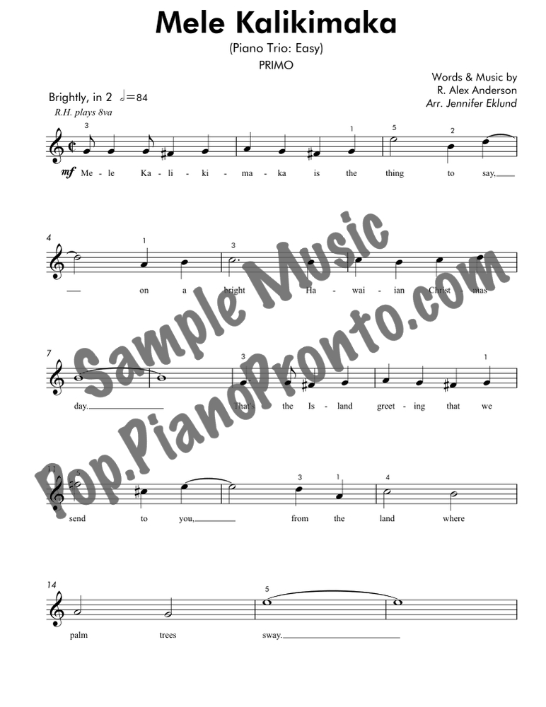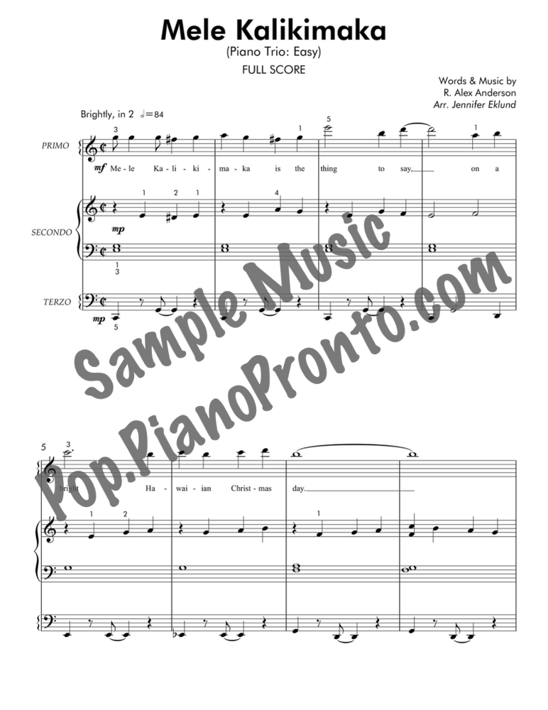 Mele Kalikimaka, an upbeat holiday favorite, stylishly arranged as an easy trio for late beginners and early intermediates by Jennifer Eklund. This ensemble piece serves as a great introduction to easy collaborative playing and will also be effective in group piano settings with multiple keyboards. Purchase includes separated parts and a full conductors score.