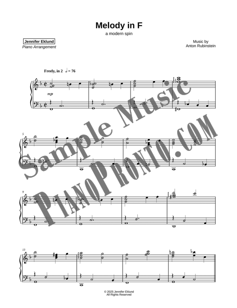 A modern lyrical spin on Anton Rubinstein's Melody in F (Op 3., No. 1). This arrangement by Jennifer Eklund is ideal for late intermediates and up.