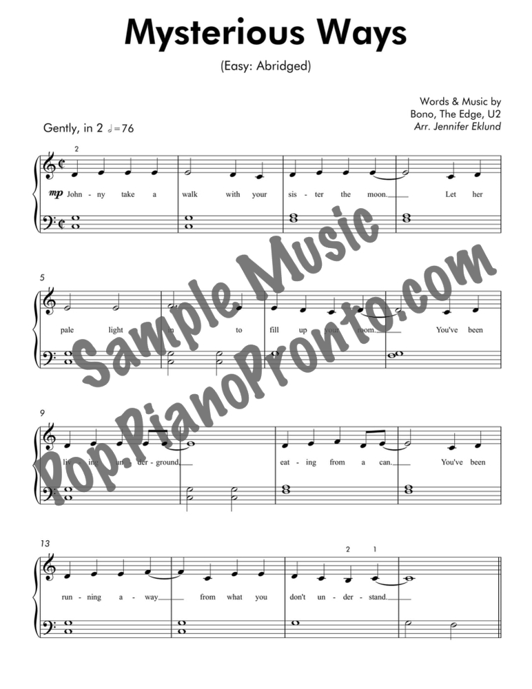Mysterious Ways, as performed by U2, in an abridged mellow arrangement for easy piano by Jennifer Eklund.