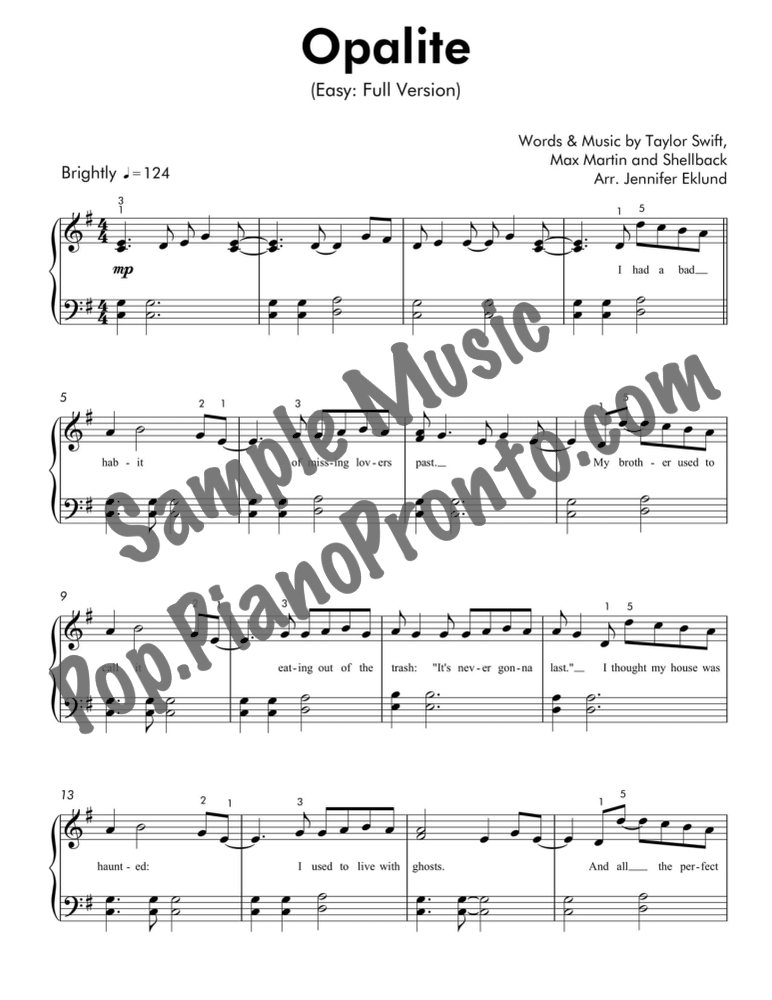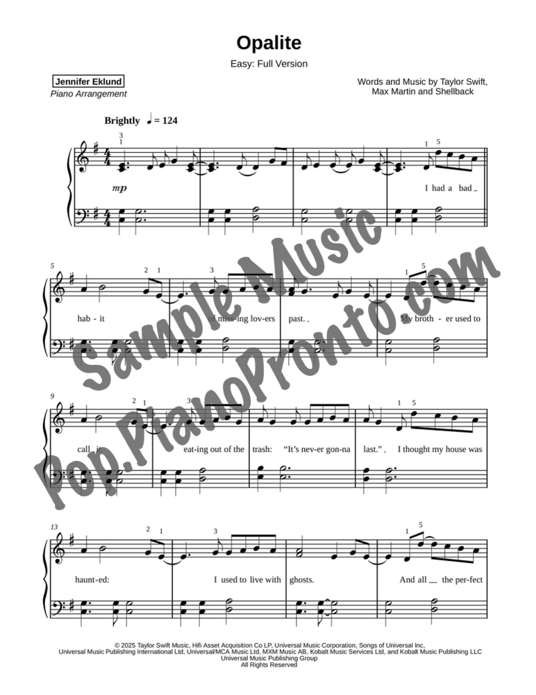 Opalite, as performed by Taylor Swift from album "The Life of a Showgirl" stylishly arranged for easy piano solo by Jennifer Eklund.