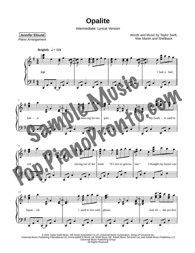 Opalite, as performed by Taylor Swift from album "The Life of a Showgirl" set here as a sparkling lyrical piano solo for intermediates by Jennifer Eklund. This version has the vocal range set higher.