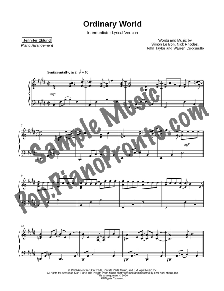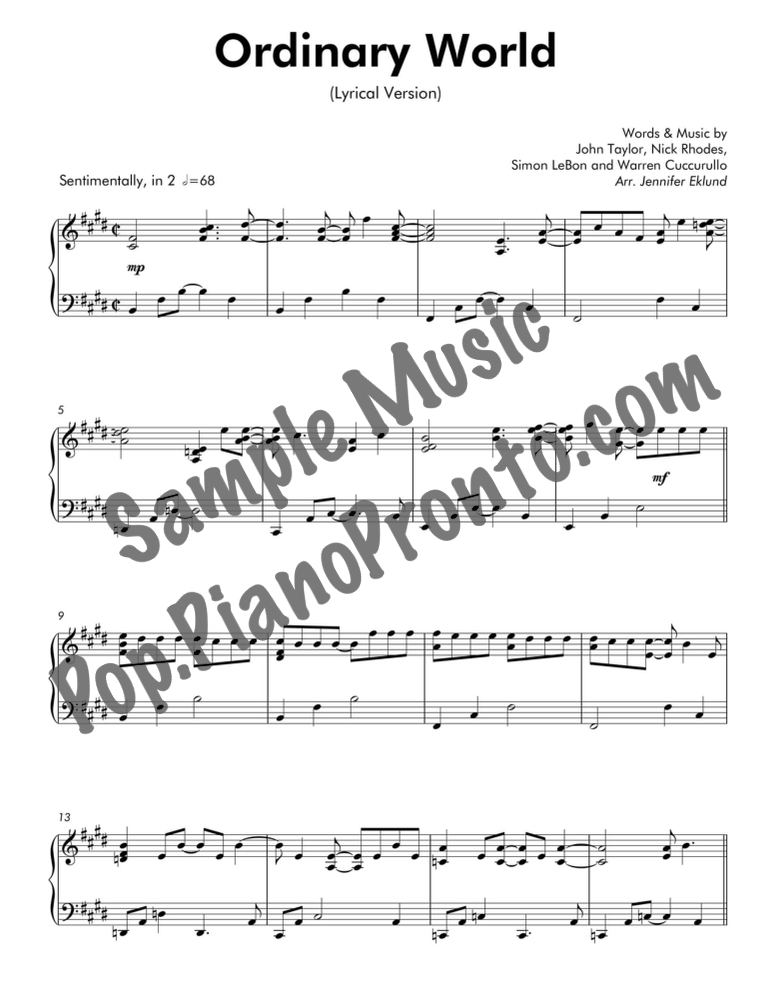 Ordinary World, as performed by Duran Duran, in a mellow arrangement for late intermediate piano by Jennifer Eklund.