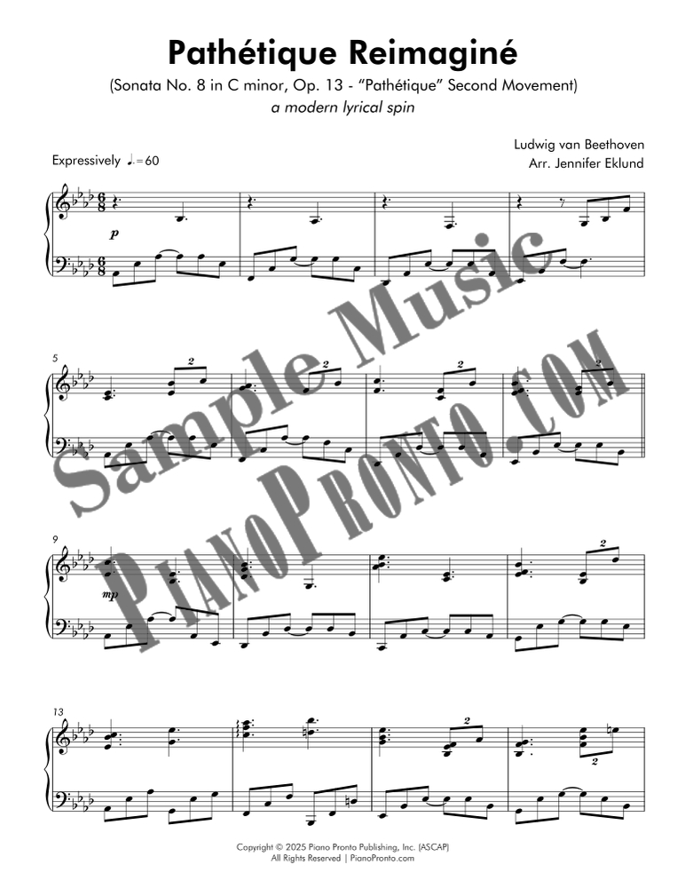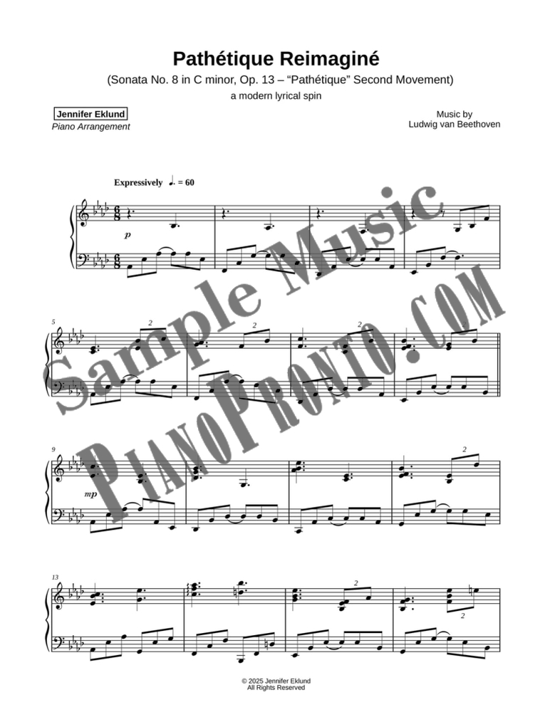 Pathétique Reimaginé, is a modern lyrical spin on the second movement of Beethoven's Piano Sonata No. 8 in C minor, Op. 13. This arrangement by Jennifer Eklund is ideal for late intermediates and up.