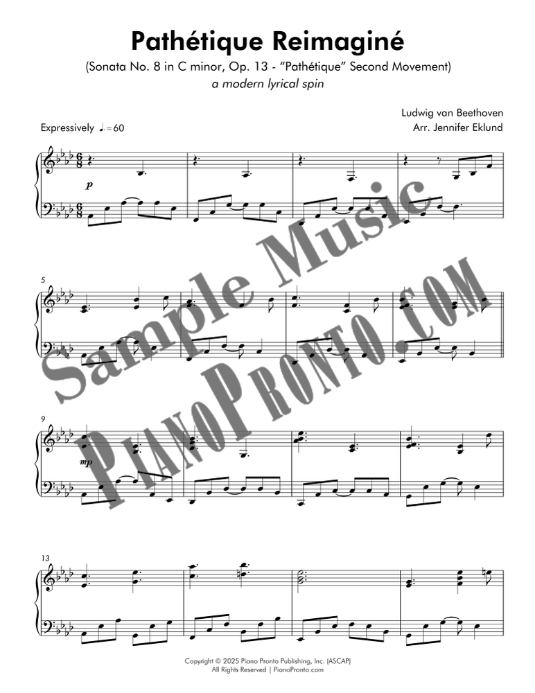 Pathétique Reimaginé, is a modern lyrical spin on the second movement of Beethoven's Piano Sonata No. 8 in C minor, Op. 13. This abridged arrangement by Jennifer Eklund is ideal for intermediates.