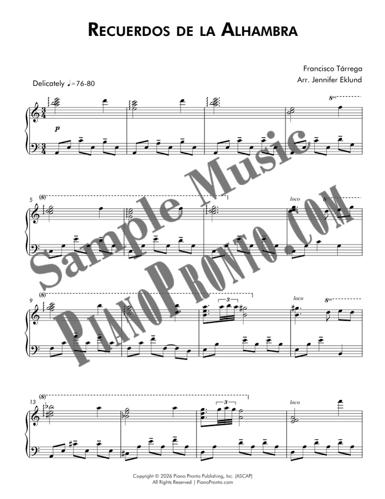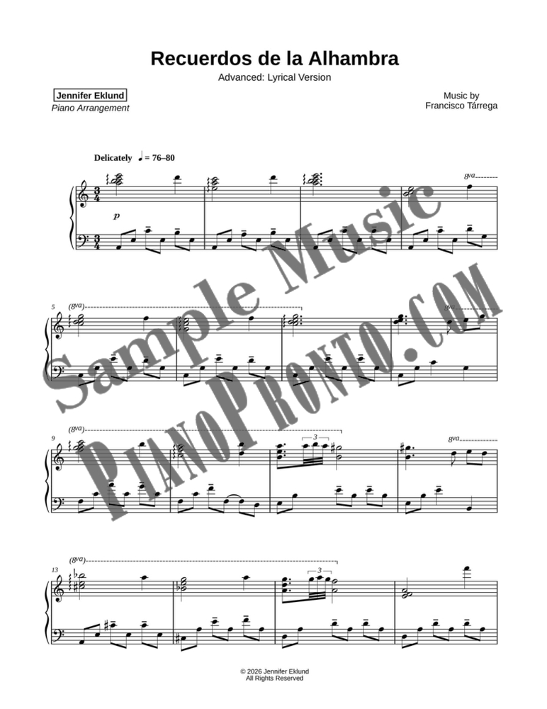 Francisco Tárrega's iconic Recuerdos de la Alhambra, arranged here in a modern contemporary lyrical style by Jennifer Eklund. This arrangement is suitable for late intermediates and up.