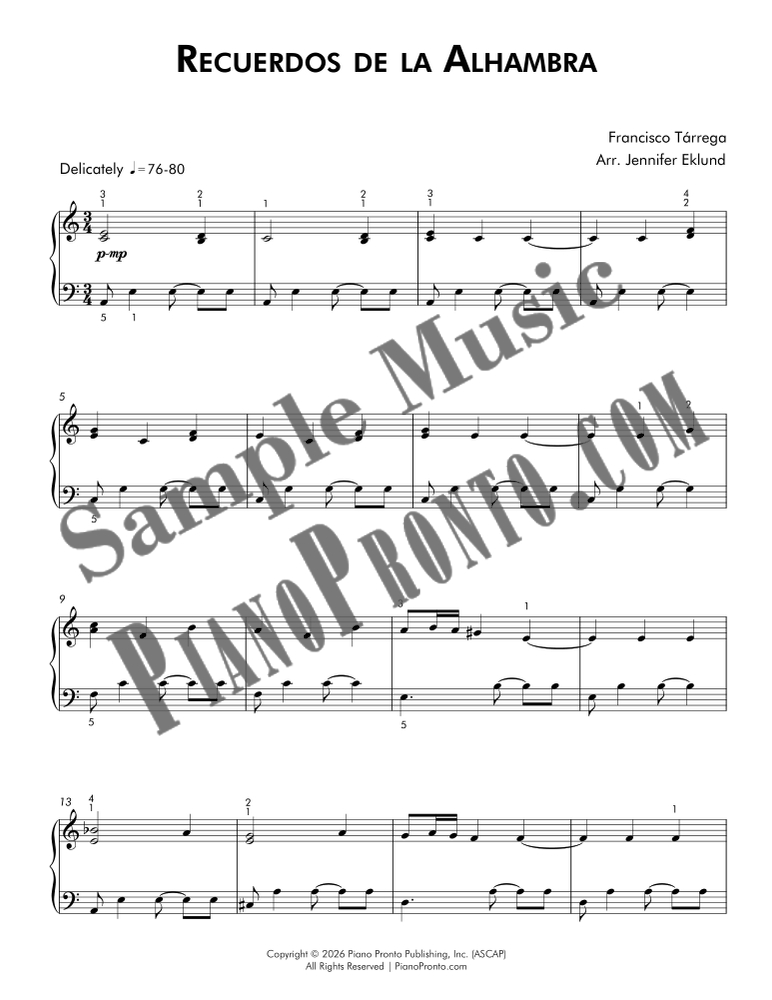 Francisco Tárrega's iconic Recuerdos de la Alhambra, arranged here in a modern contemporary lyrical style by Jennifer Eklund. This abridged arrangement is suitable for early intermediates.