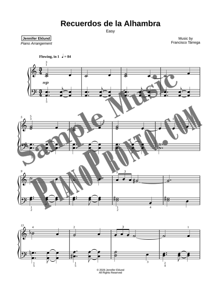 Francisco Tárrega's iconic Recuerdos de la Alhambra, arranged here in a modern contemporary lyrical style by Jennifer Eklund. This abridged arrangement is suitable for late beginners and up.