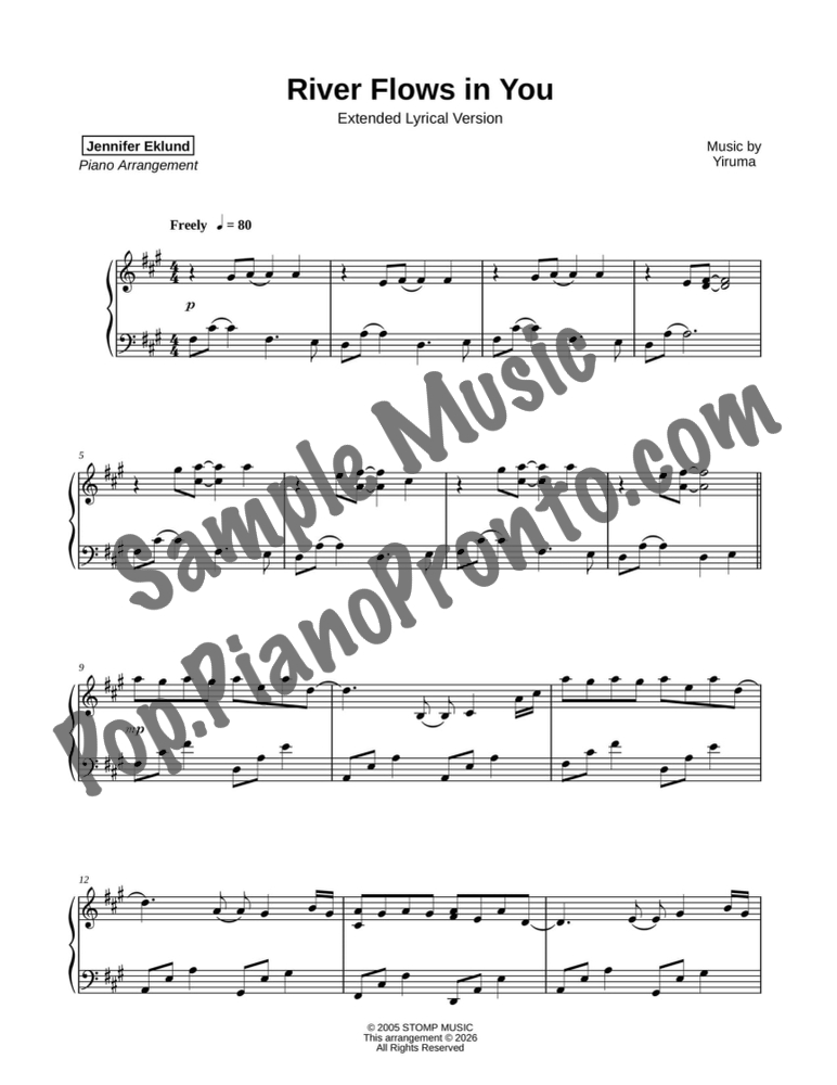 River Flows in You, composed by Yiruma, set in a sparkling lyrical arrangement for late intermediates by Jennifer Eklund. This is an extended version with added solo sections and a run-time just over 6 minutes.