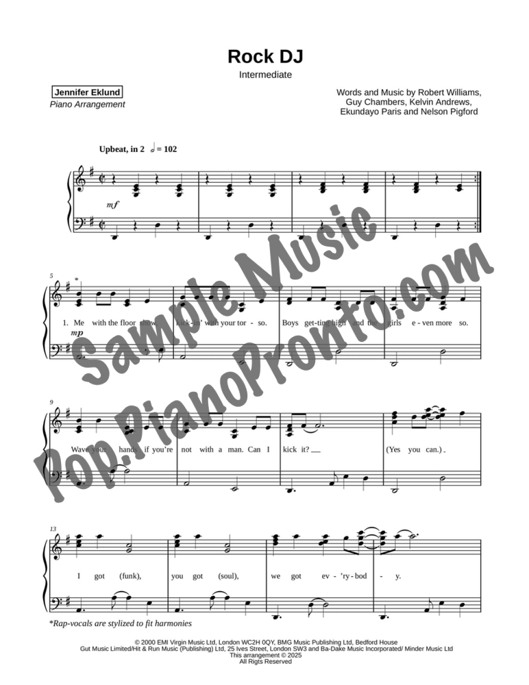 Rock DJ, as performed by Robbie Williams, stylishly arranged for intermediate piano by Jennifer Eklund.