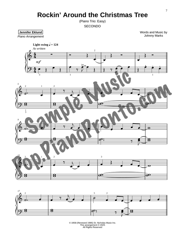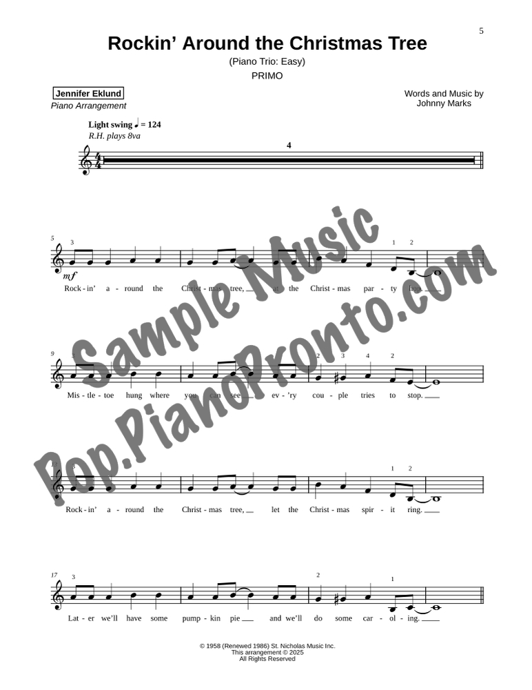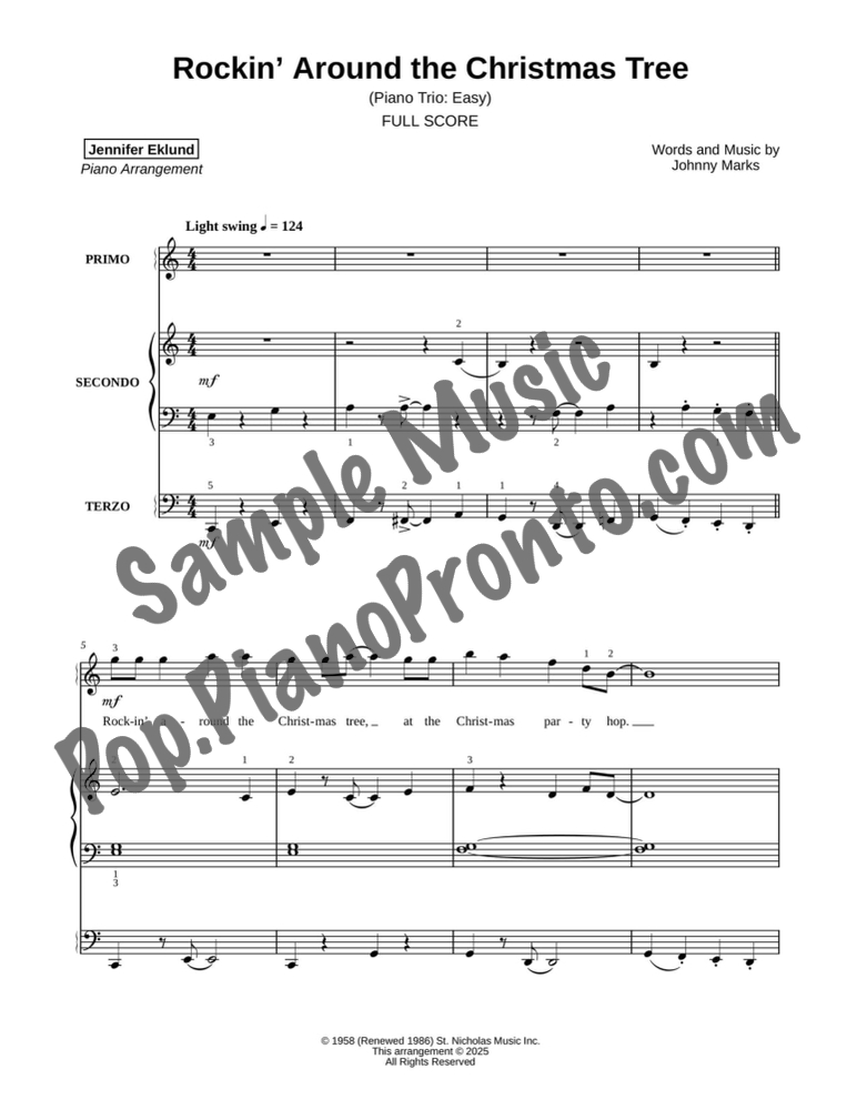 Rockin' Around the Christmas Tree, a jolly jazzy holiday favorite, stylishly arranged as an easy trio for late beginners and early intermediates by Jennifer Eklund. This ensemble piece serves as a great introduction to easy collaborative playing and will also be effective in group piano settings with multiple keyboards. Purchase includes separated parts and a full conductors score.