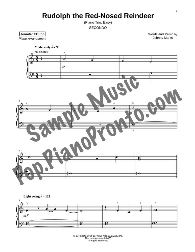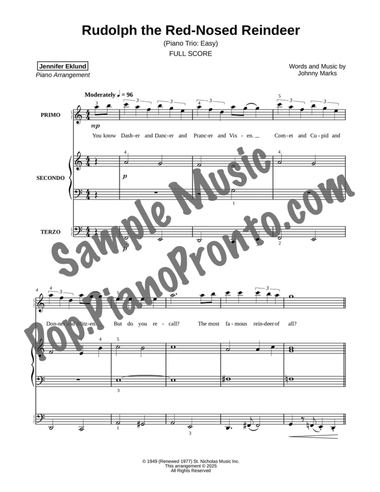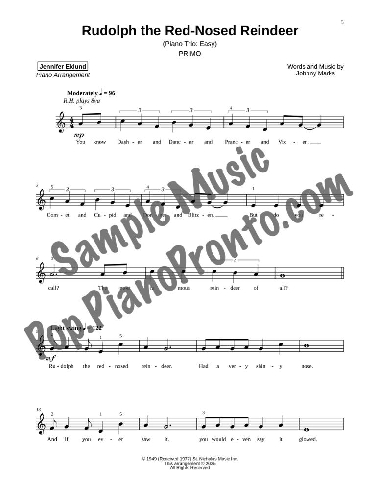 Rudolph the Red-Nosed Reindeer, a classic holiday favorite, stylishly arranged as an easy trio for late beginners and early intermediates by Jennifer Eklund. This ensemble piece serves as a great introduction to easy collaborative playing and will also be effective in group piano settings with multiple keyboards. Purchase includes separated parts and a full conductors score.