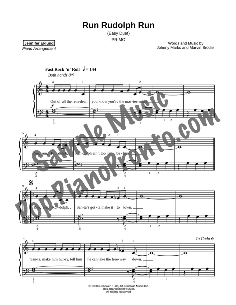 Run Rudolph Run, a rockin' Chuck Berry holiday favorite, stylishly arranged as an evenly-leveled piano duet for late beginners and early intermediates by Jennifer Eklund.