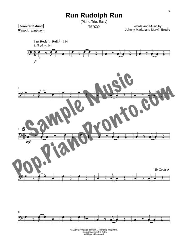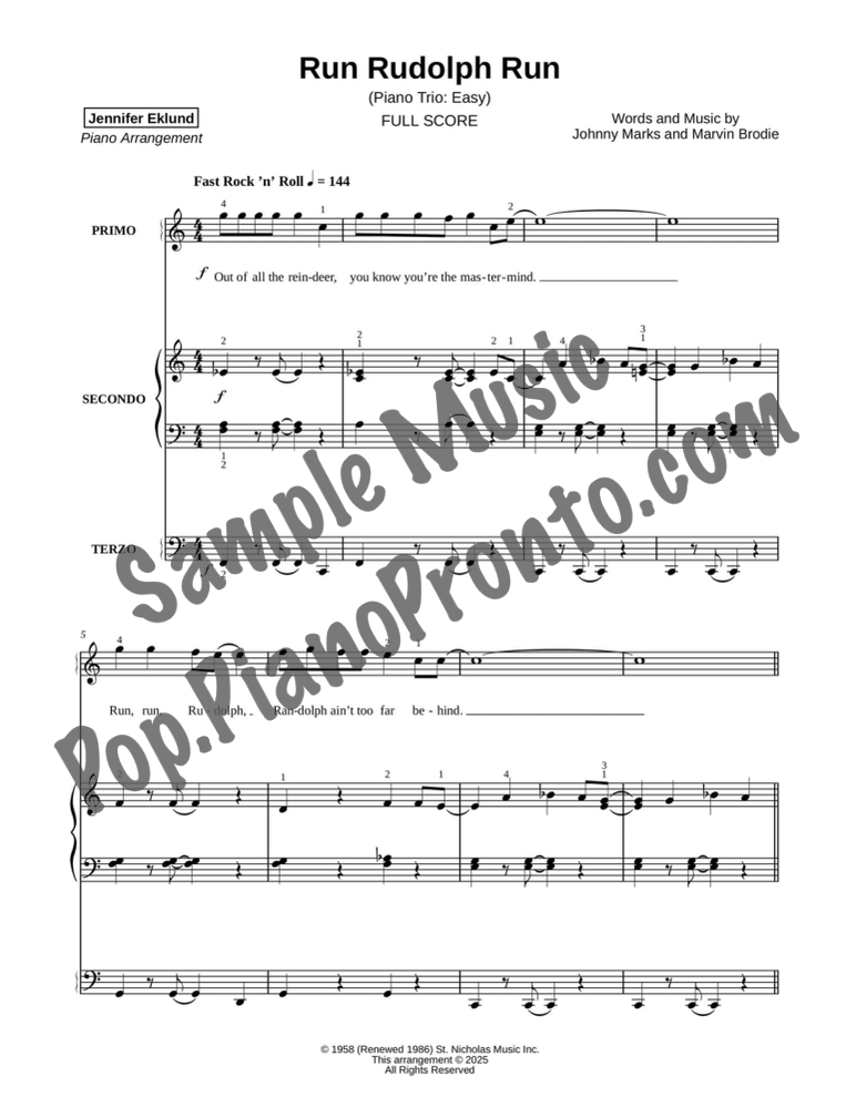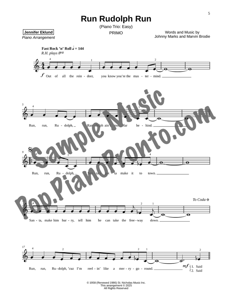 Run Rudolph Run, a rockin' holiday classic, stylishly arranged as an easy trio for late beginners and early intermediates by Jennifer Eklund. This ensemble piece serves as a great introduction to easy collaborative playing and will also be effective in group piano settings with multiple keyboards. Purchase includes separated parts and a full conductors score.