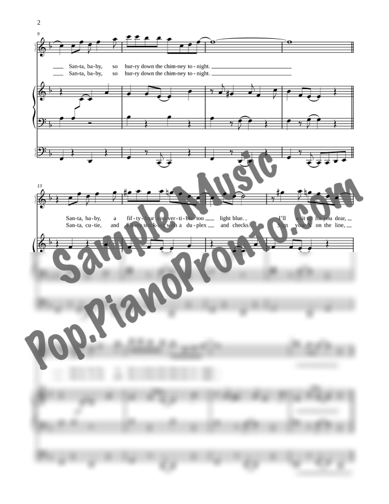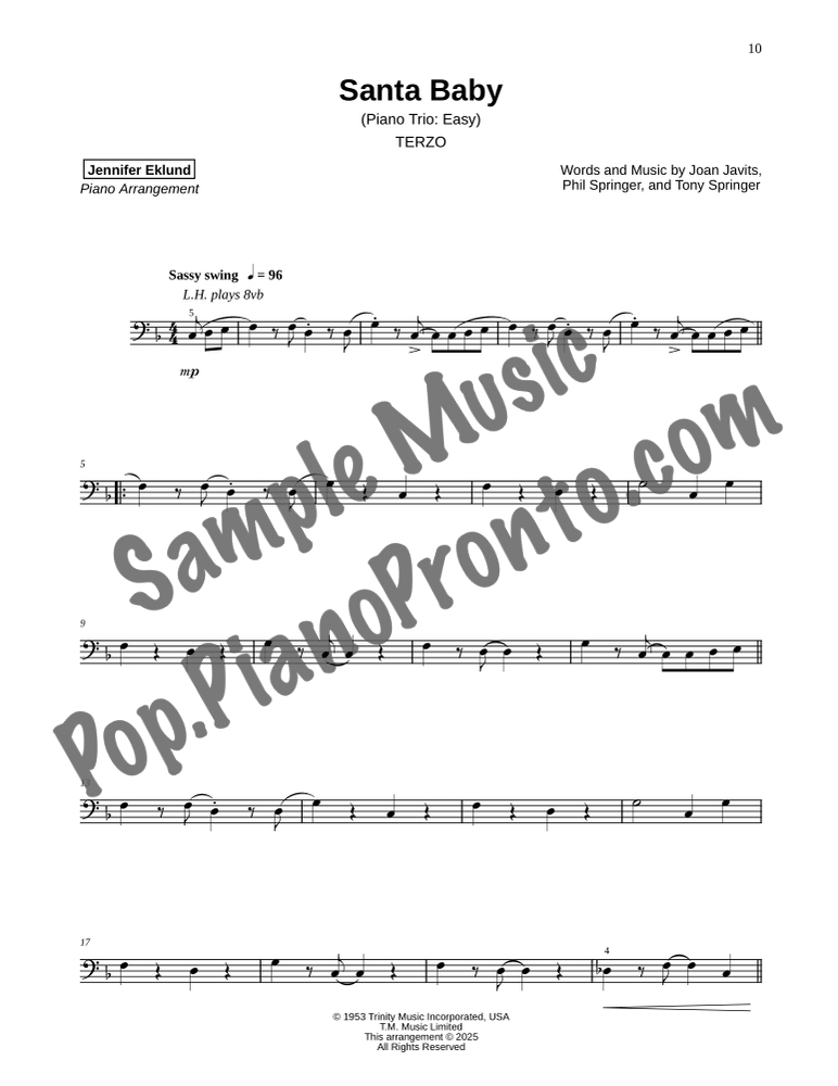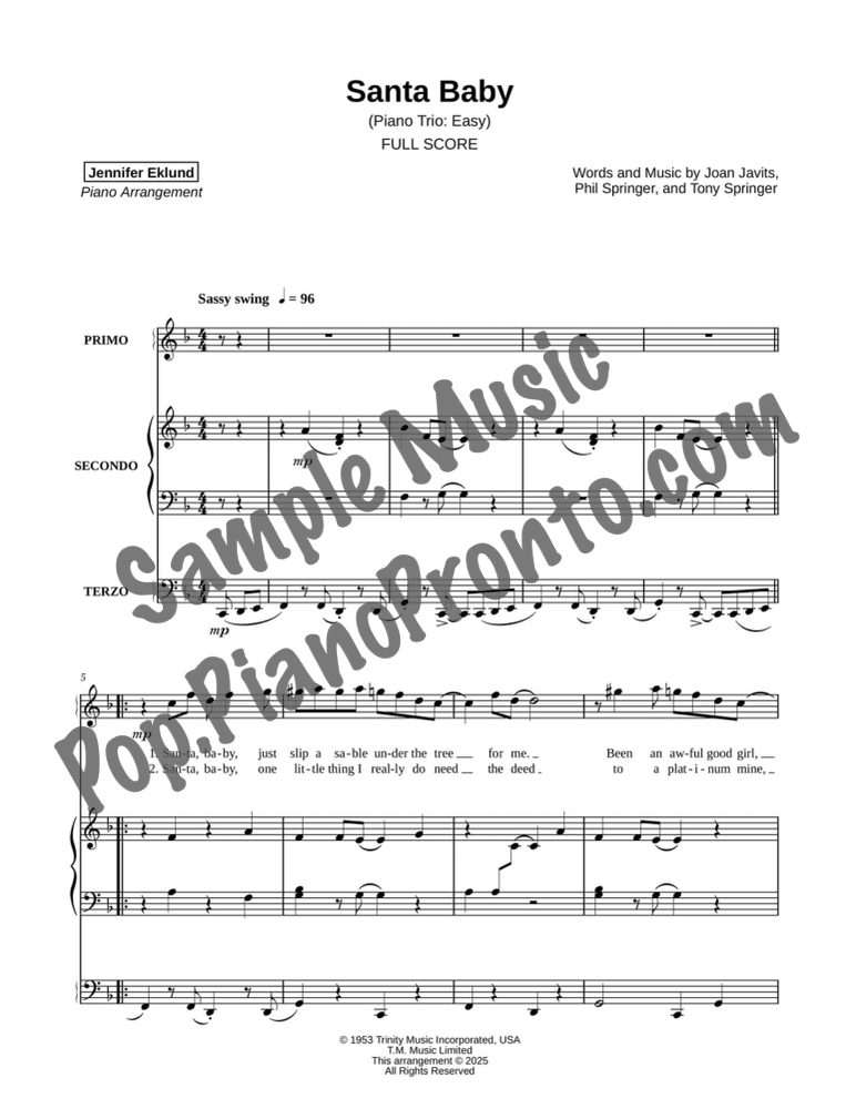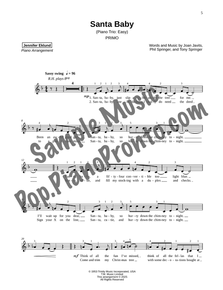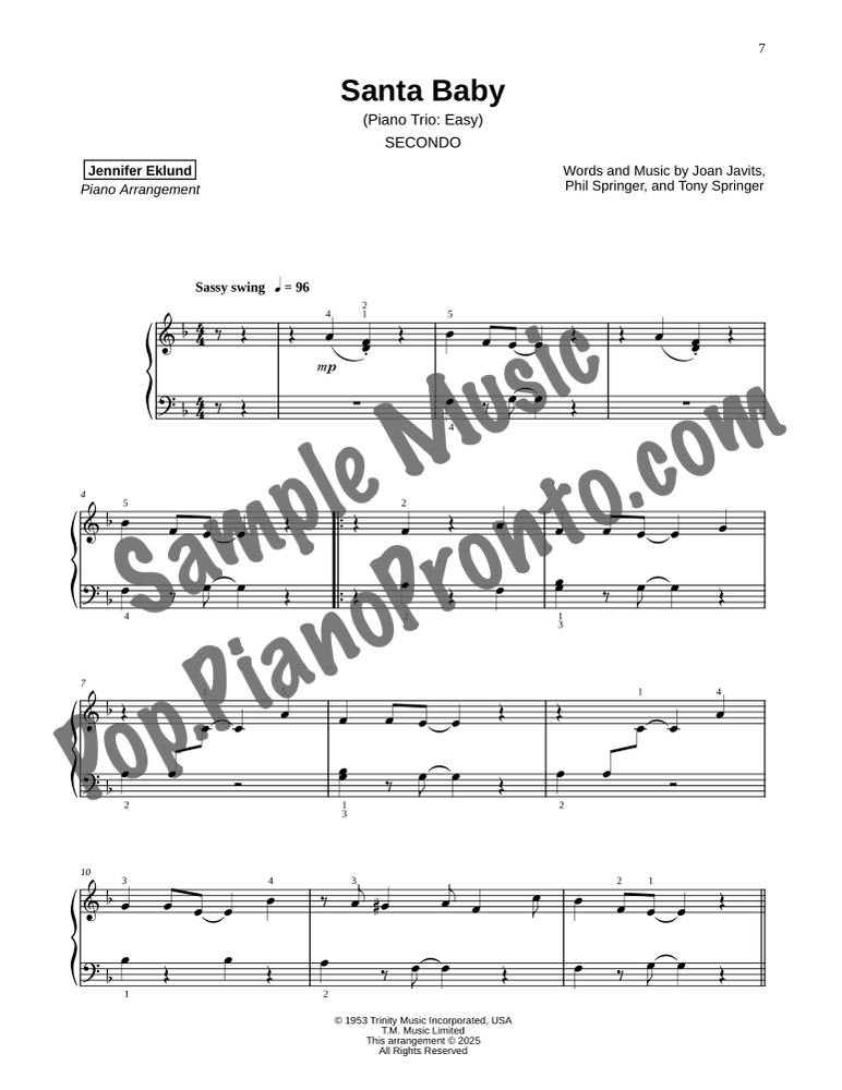 Santa Baby, a sassy holiday favorite, stylishly arranged as an easy trio for late beginners and early intermediates by Jennifer Eklund. This ensemble piece serves as a great introduction to easy collaborative playing and will also be effective in group piano settings with multiple keyboards. Purchase includes separated parts and a full conductors score.