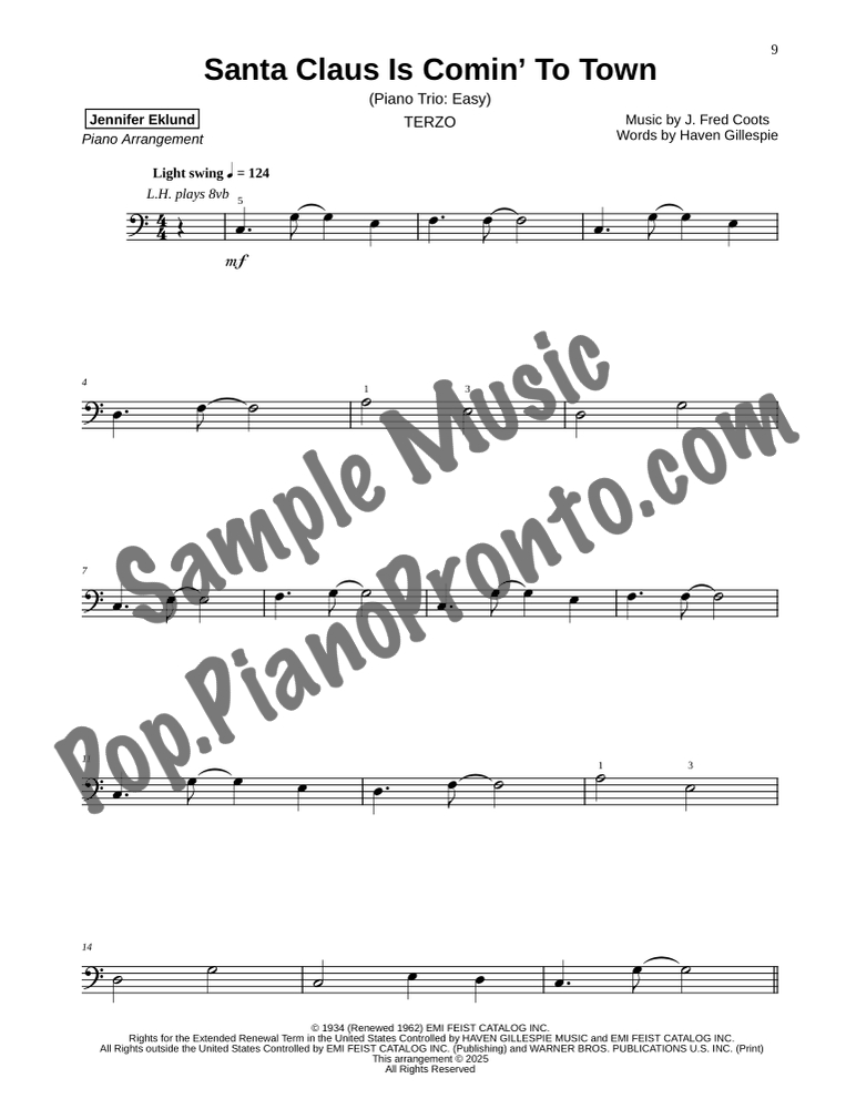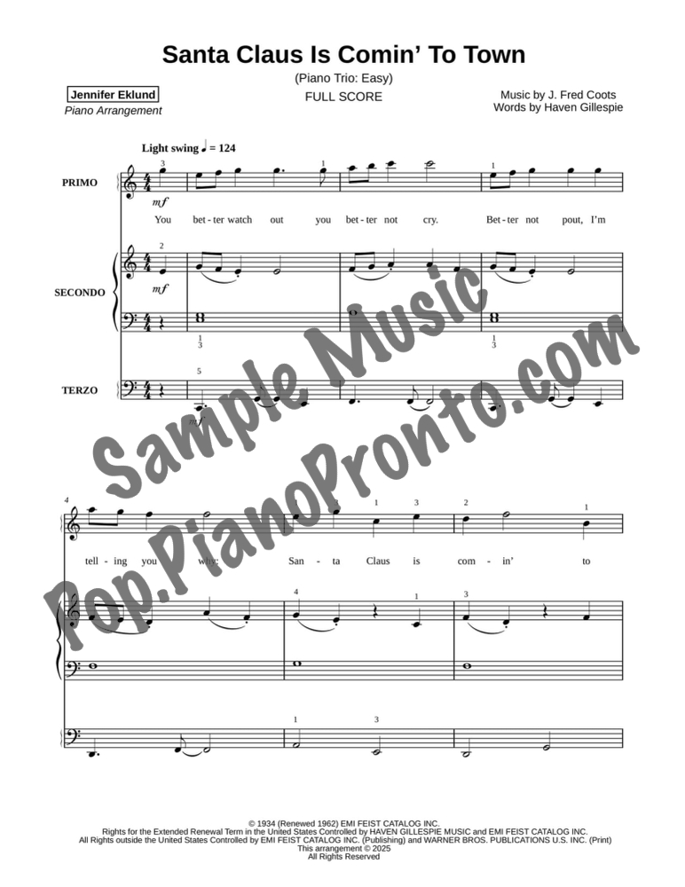 Santa Claus Is Comin' to Town, an upbeat holiday favorite, stylishly arranged as an easy trio for late beginners and early intermediates by Jennifer Eklund. This ensemble piece serves as a great introduction to easy collaborative playing and will also be effective in group piano settings with multiple keyboards. Purchase includes separated parts and a full conductors score.