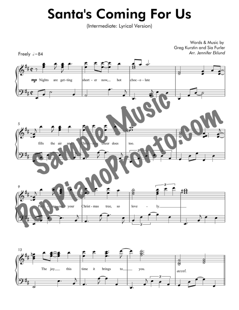 Santa's Coming for Us, as performed by Sia, set as a sparkling lyrical solo for late intermediate piano by Jennifer Eklund.
