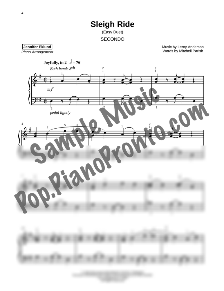 Sleigh Ride, an upbeat holiday favorite, stylishly arranged as an evenly-leveled piano duet for late beginners and early intermediates by Jennifer Eklund.
