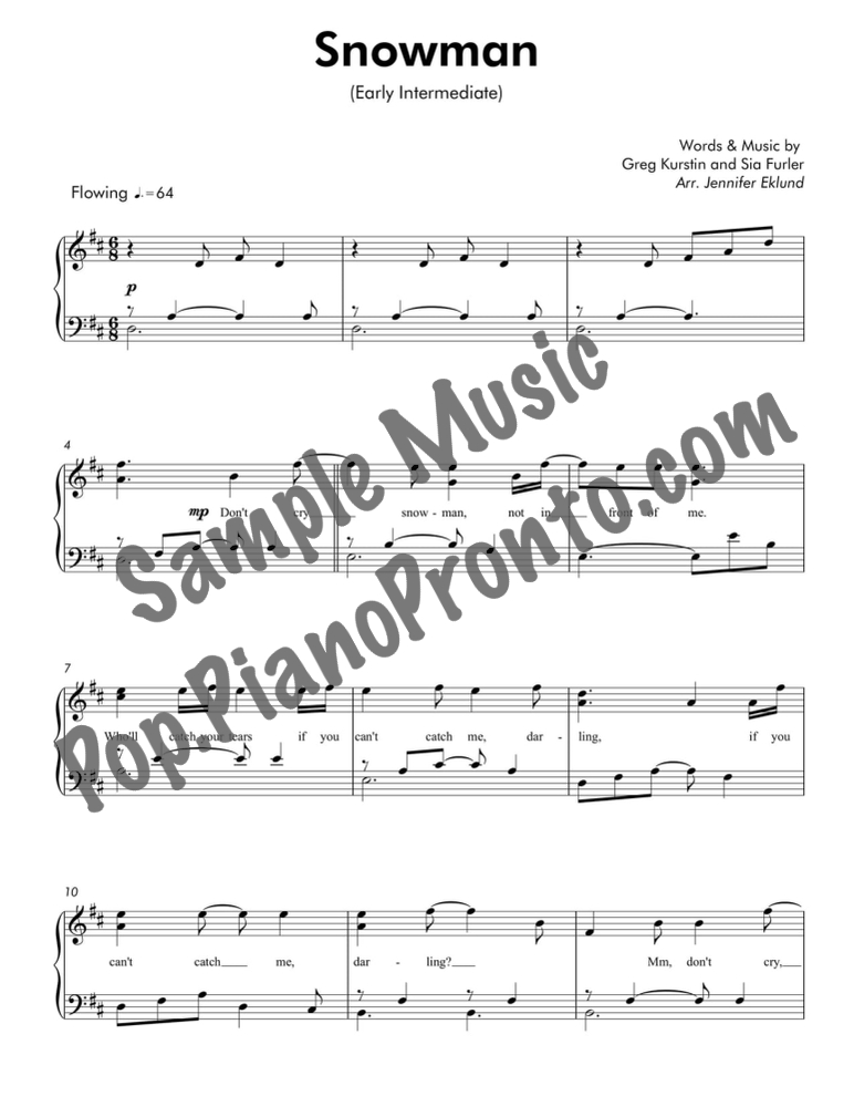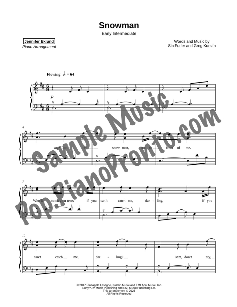 Snowman, as performed by Sia, stylishly arranged for early intermediate piano by Jennifer Eklund.