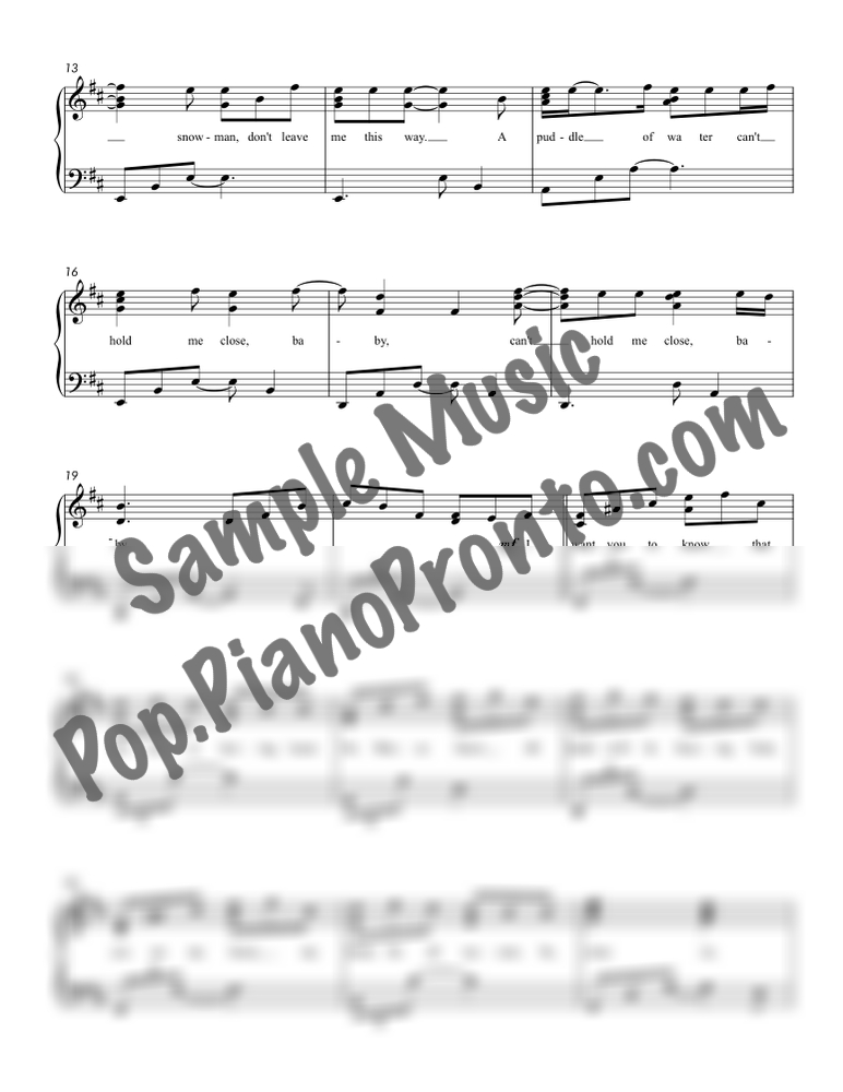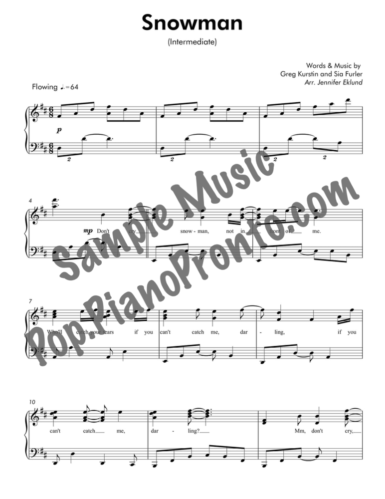Snowman, as performed by Sia, set as a sparkling lyrical arrangement for intermediate piano by Jennifer Eklund.