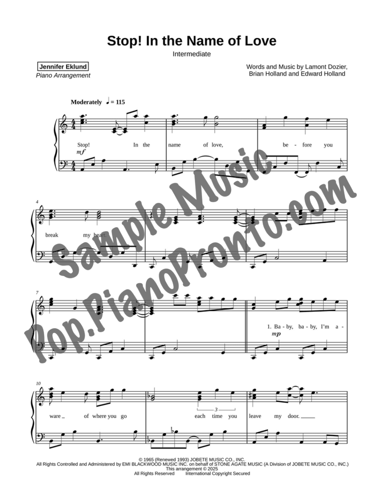 Stop! In the Name of Love, as performed by Diana Ross & The Supremes, stylishly arranged for intermediate piano by Jennifer Eklund.