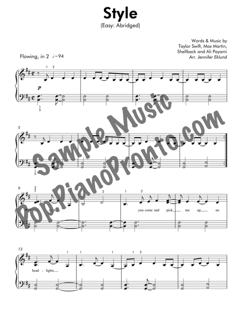 Style, as performed by Taylor Swift, stylishly abridged and arranged for easy piano by Jennifer Eklund.