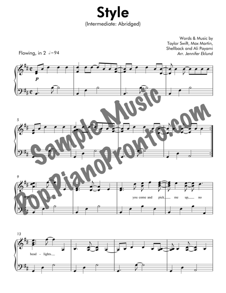 Style, as performed by Taylor Swift, stylishly abridged and arranged for intermediate piano by Jennifer Eklund.