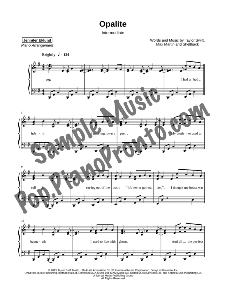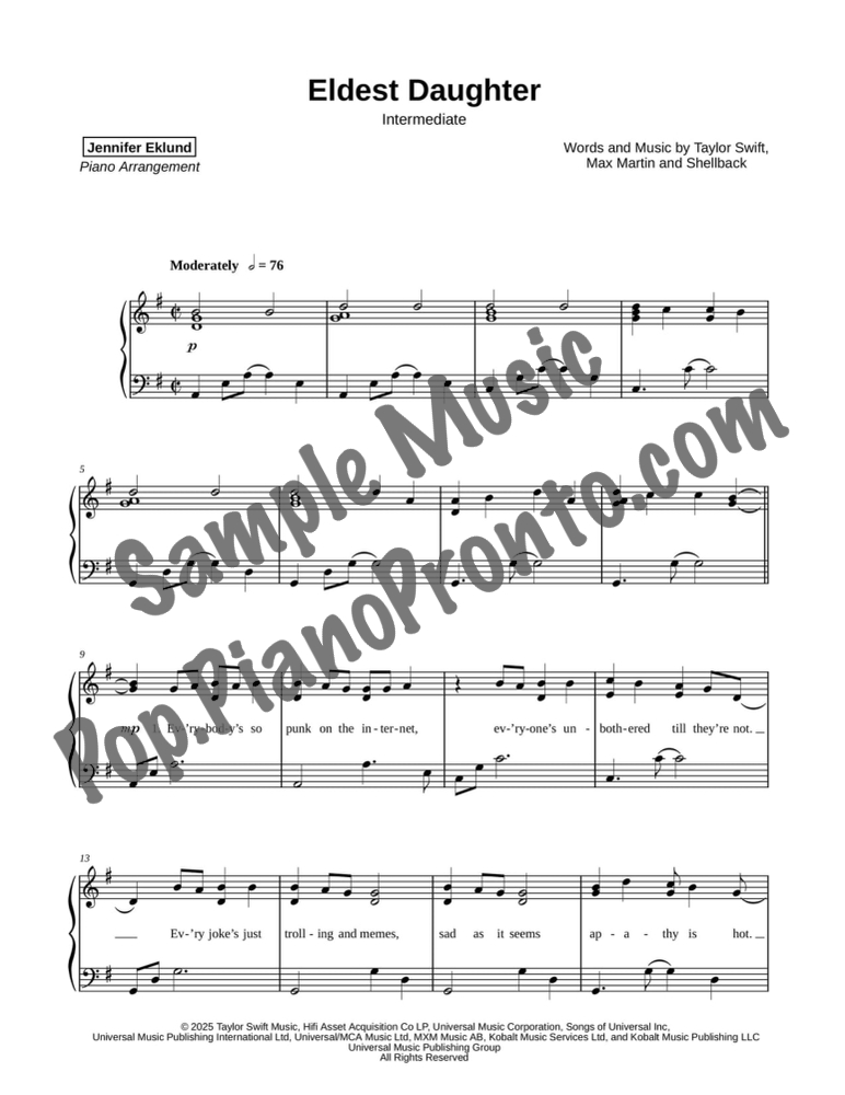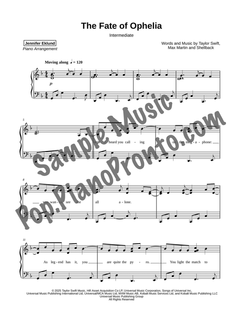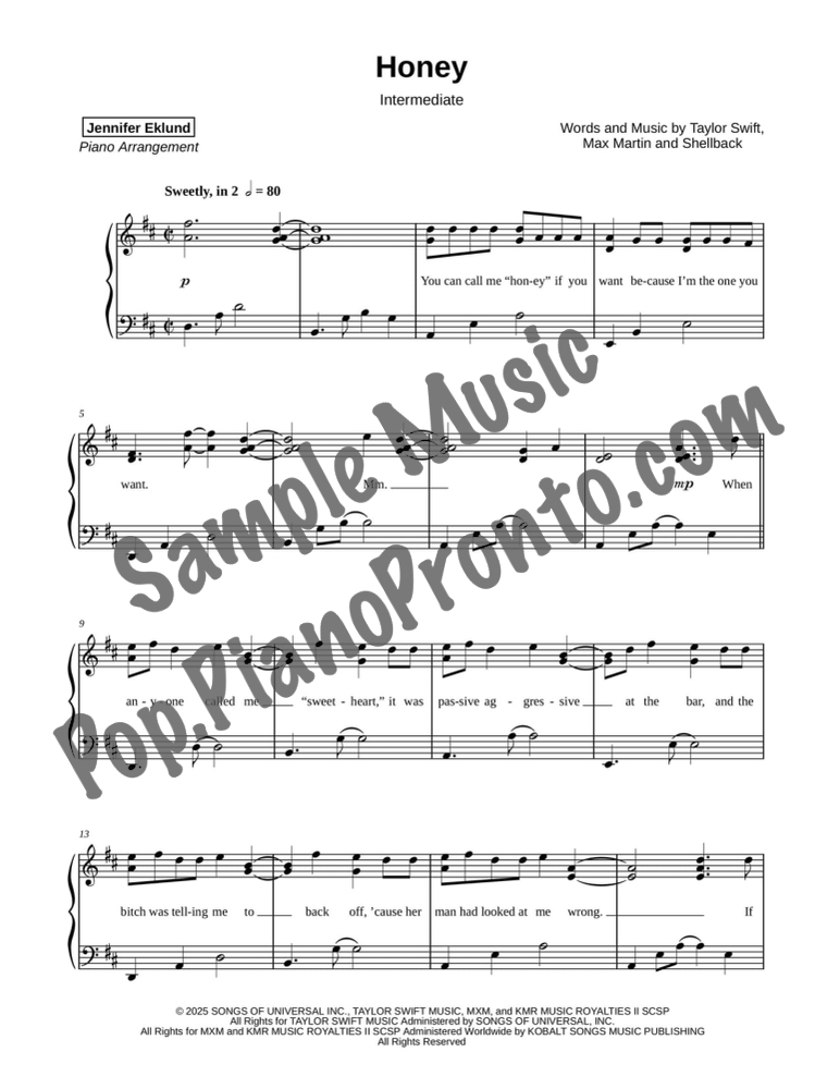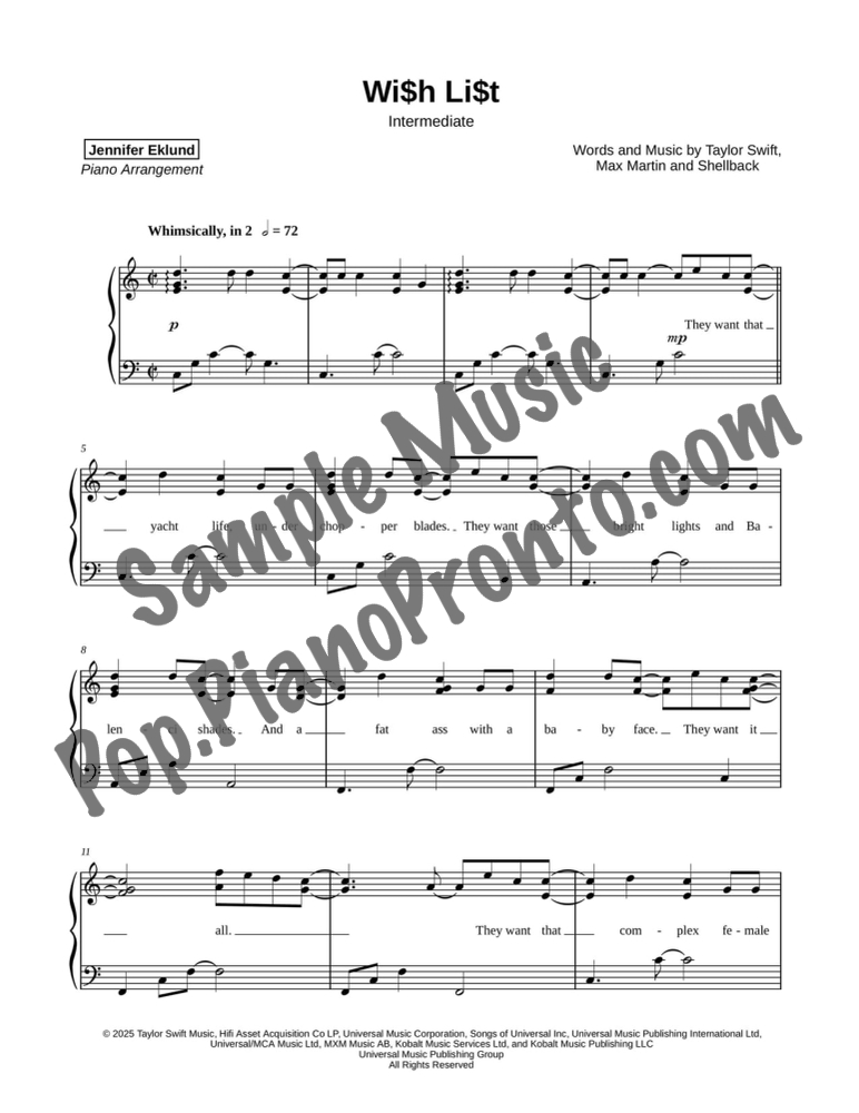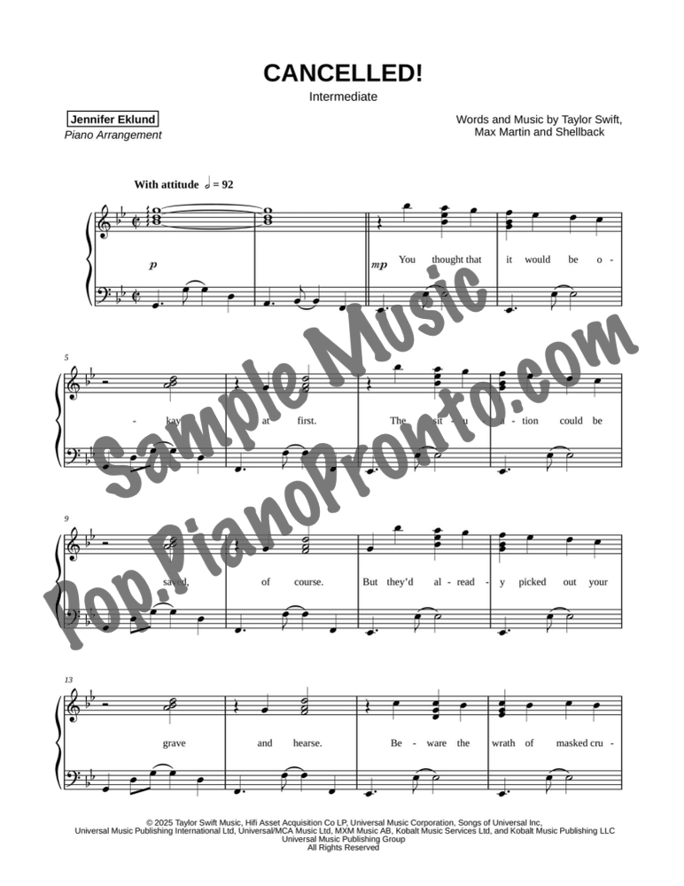 This songbook includes all twelve songs from Taylor Swift's album "The Life of a Showgirl." These intermediate level arrangements, by Jennifer Eklund, are full-length versions of the songs and will light up any performance opportunity.