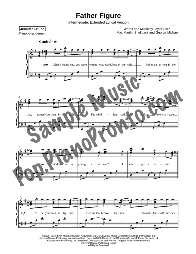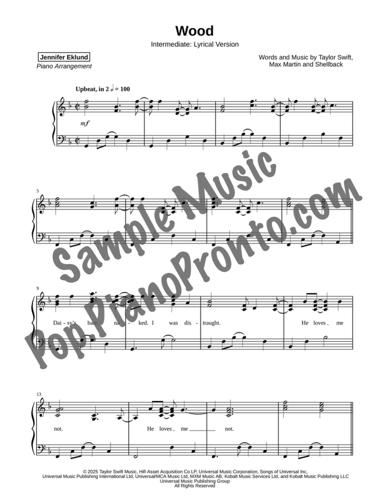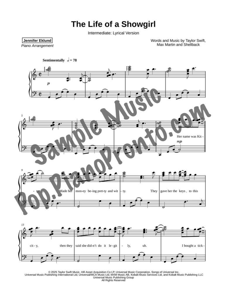 This songbook includes all twelve songs from Taylor Swift's album "The Life of a Showgirl." These arrangements, by Jennifer Eklund, feature lyrical and extended versions of the songs and are graded for late intermediates and up. These are professional level arrangements that will light up any performance opportunity.