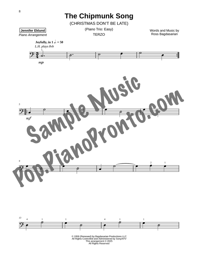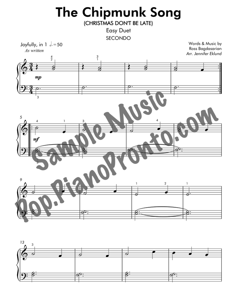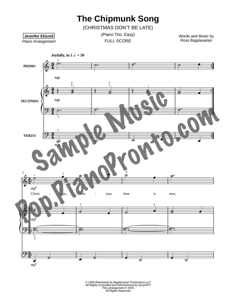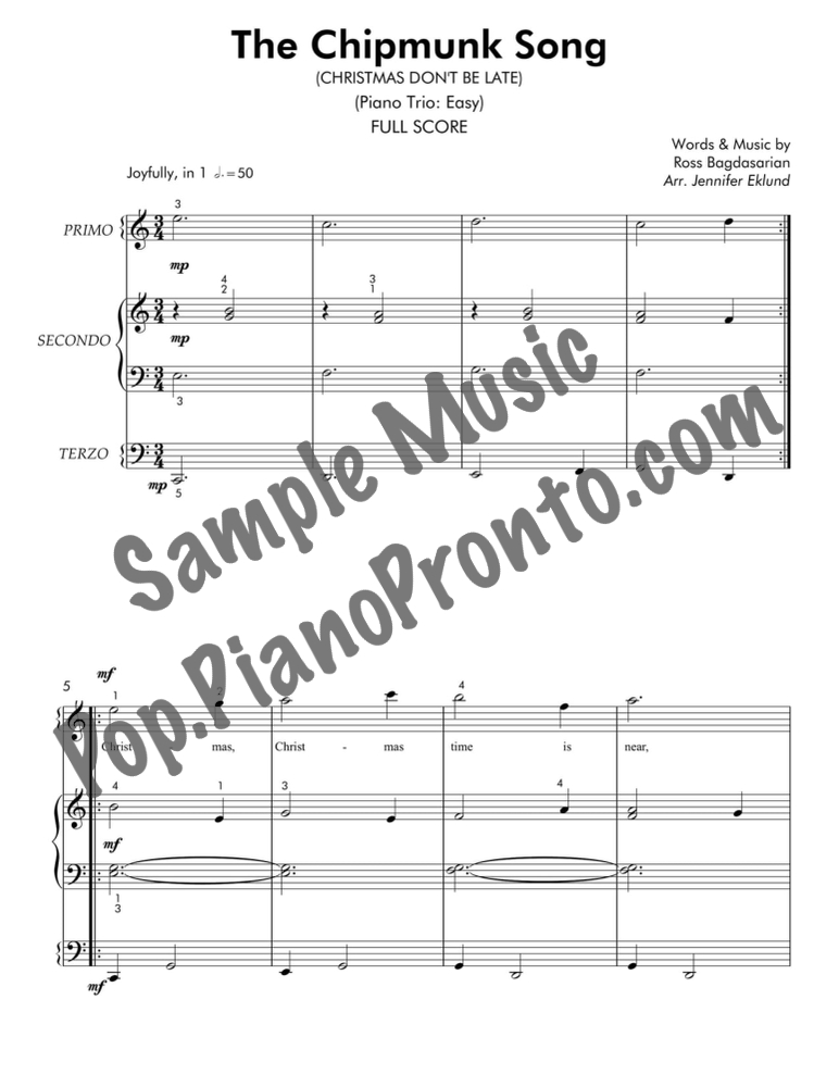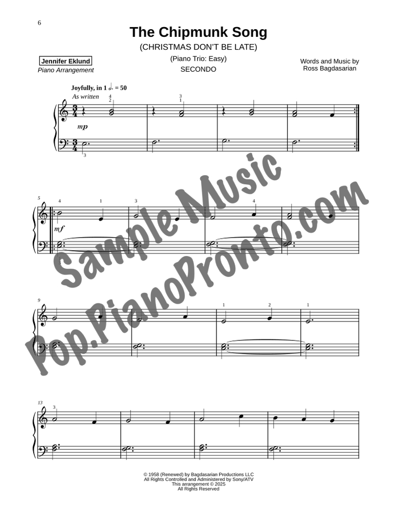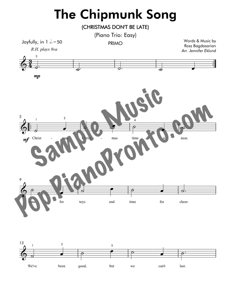 The Chipmunk Song (Christmas Don't Be Late), a joyful holiday favorite, stylishly arranged as an easy trio for late beginners and early intermediates by Jennifer Eklund. This ensemble piece serves as a great introduction to easy collaborative playing and will also be effective in group piano settings with multiple keyboards. Purchase includes separated parts and a full conductors score.