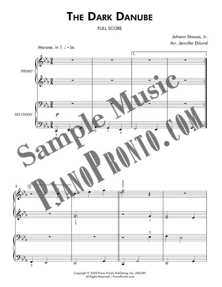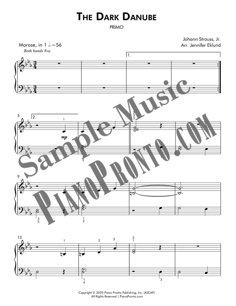 The Dark Danube is a minor-key spin on Strauss’s iconic Blue Danube Waltz set here as and evenly-leveled duet for late beginners and early intermediates. This arrangement by Jennifer Eklund includes both a stacked score and separated parts.
