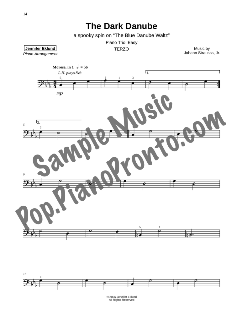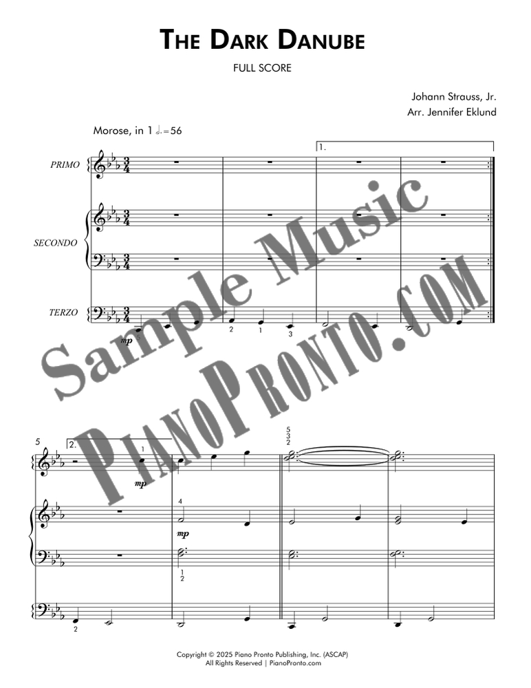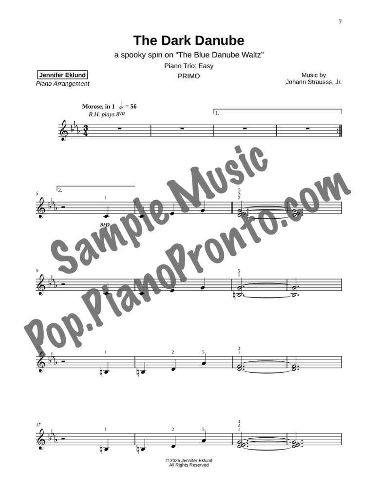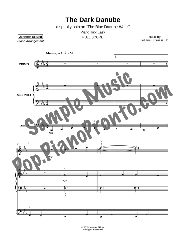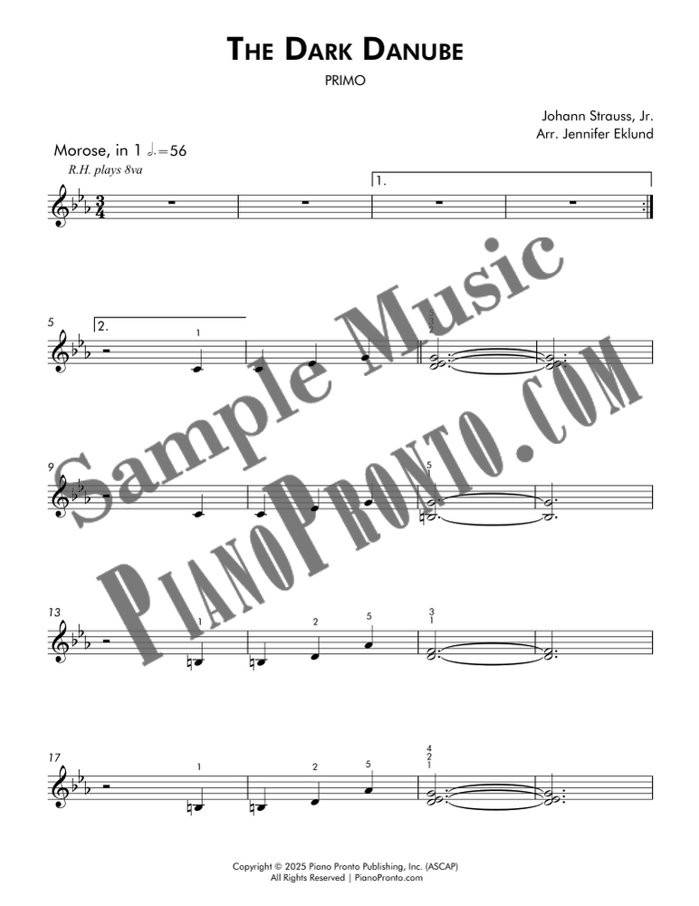 The Dark Danube is a minor-key spin on Strauss’s iconic Blue Danube Waltz set here as and evenly-leveled duet for late beginners and early intermediates. This arrangement by Jennifer Eklund includes both a stacked score and separated parts.