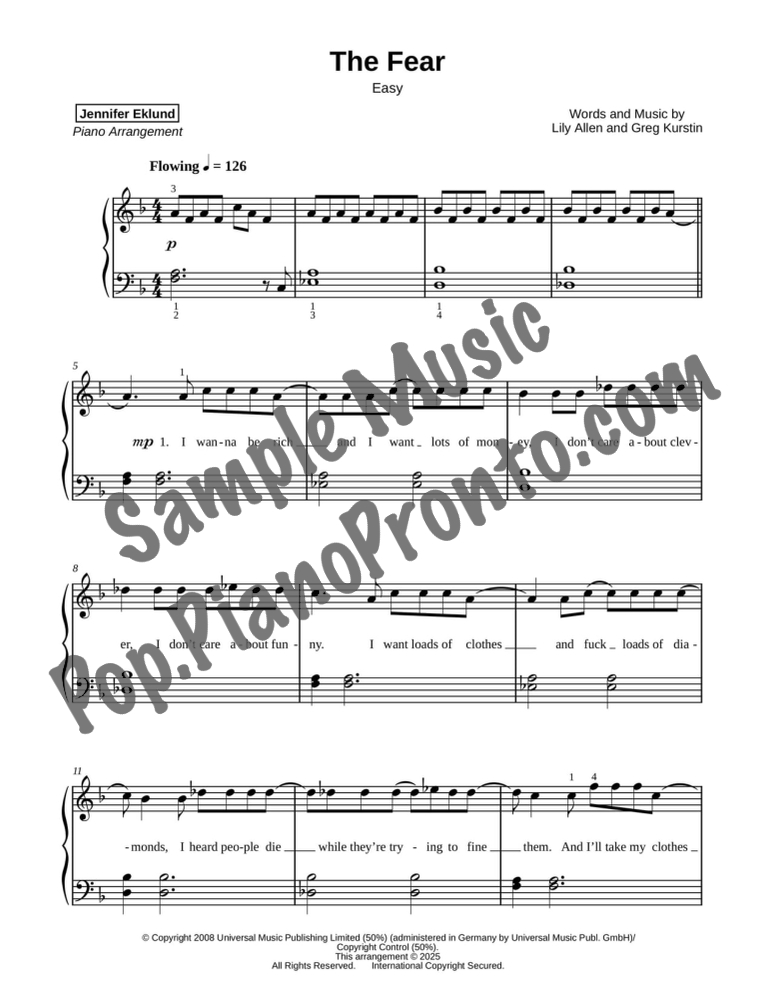 The Fear, as performed by Lily Allen, stylishly arranged for easy piano by Jennifer Eklund.