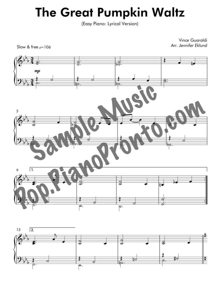 The Great Pumpkin Waltz, composed by Vince Guaraldi, set here as a sparkling lyrical piano solo for easy piano by Jennifer Eklund.