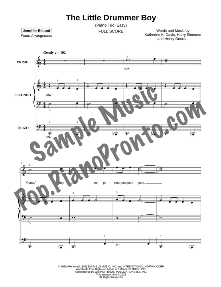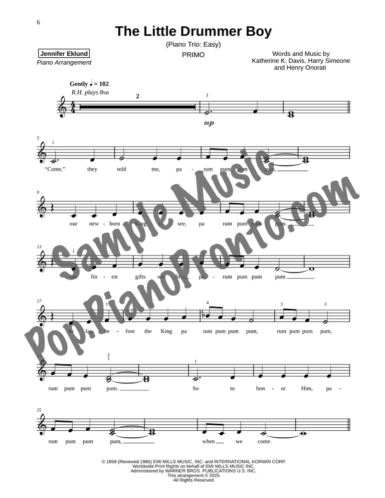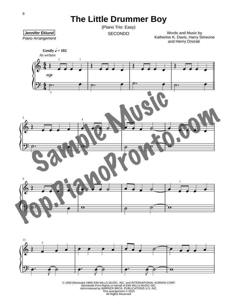 The Little Drummer Boy, a perennial holiday favorite, stylishly arranged as an easy trio for late beginners and early intermediates by Jennifer Eklund. This ensemble piece serves as a great introduction to easy collaborative playing and will also be effective in group piano settings with multiple keyboards. Purchase includes separated parts and a full conductors score.