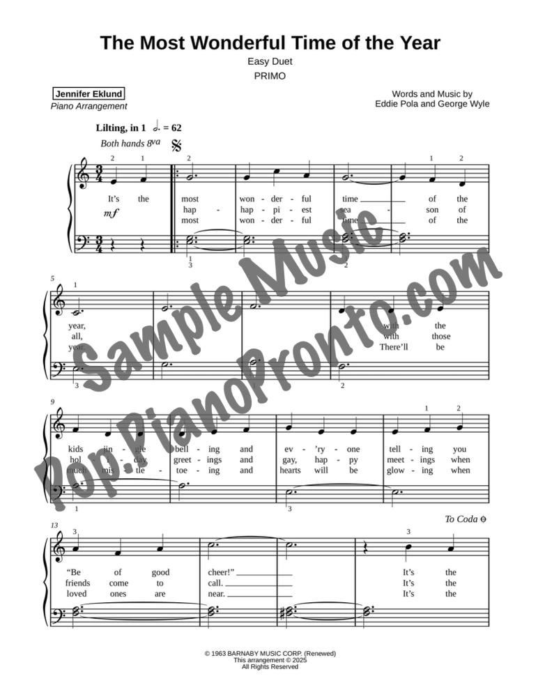 The Most Wonderful Time of the Year, a lilting holiday favorite, stylishly arranged as an evenly-leveled piano duet for late beginners and early intermediates by Jennifer Eklund.