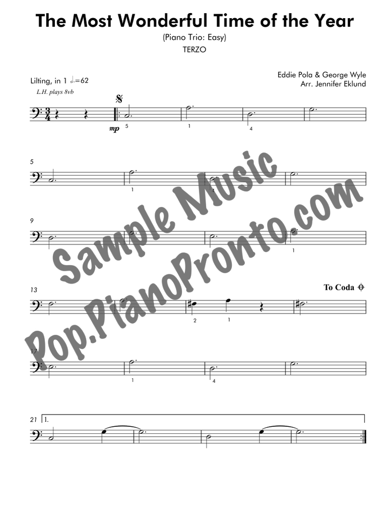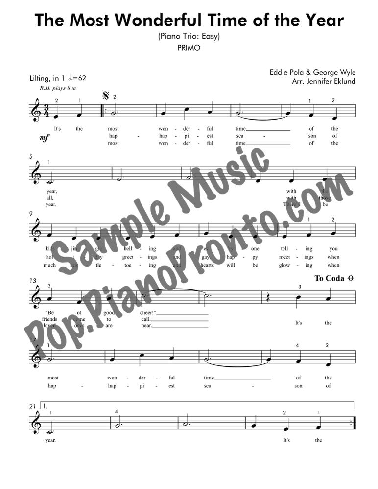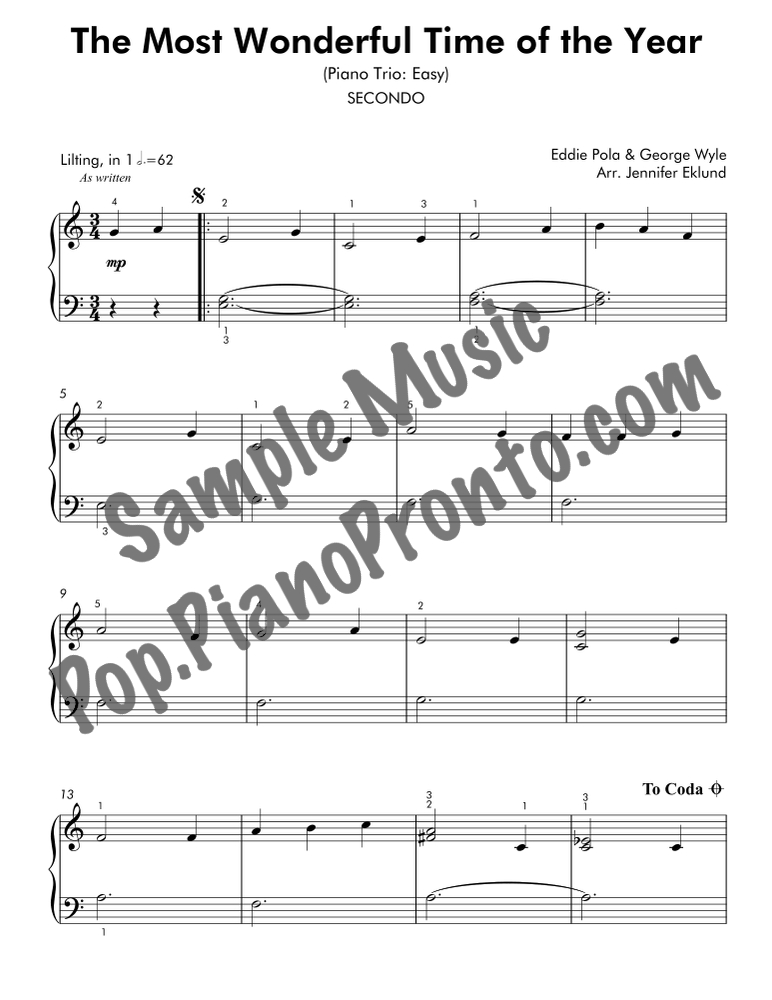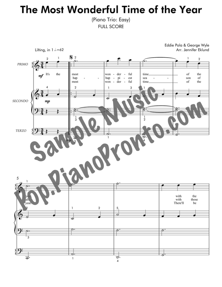 The Most Wonderful Time of the Year, an upbeat holiday favorite, stylishly arranged as an easy trio for late beginners and early intermediates by Jennifer Eklund. This ensemble piece serves as a great introduction to easy collaborative playing and will also be effective in group piano settings with multiple keyboards. Purchase includes separated parts and a full conductors score.