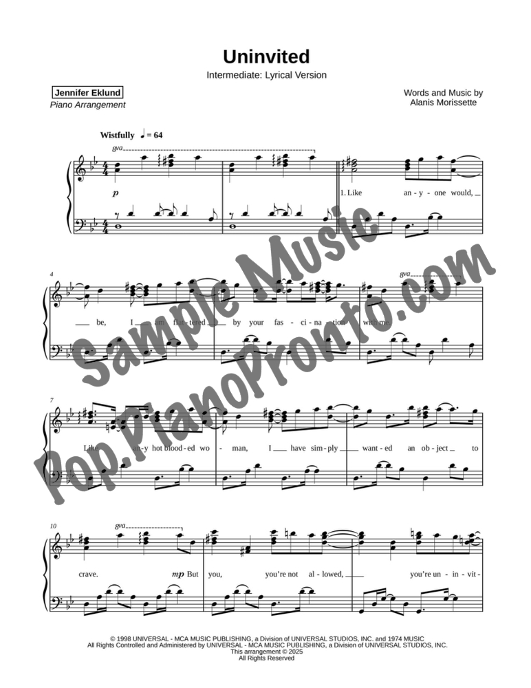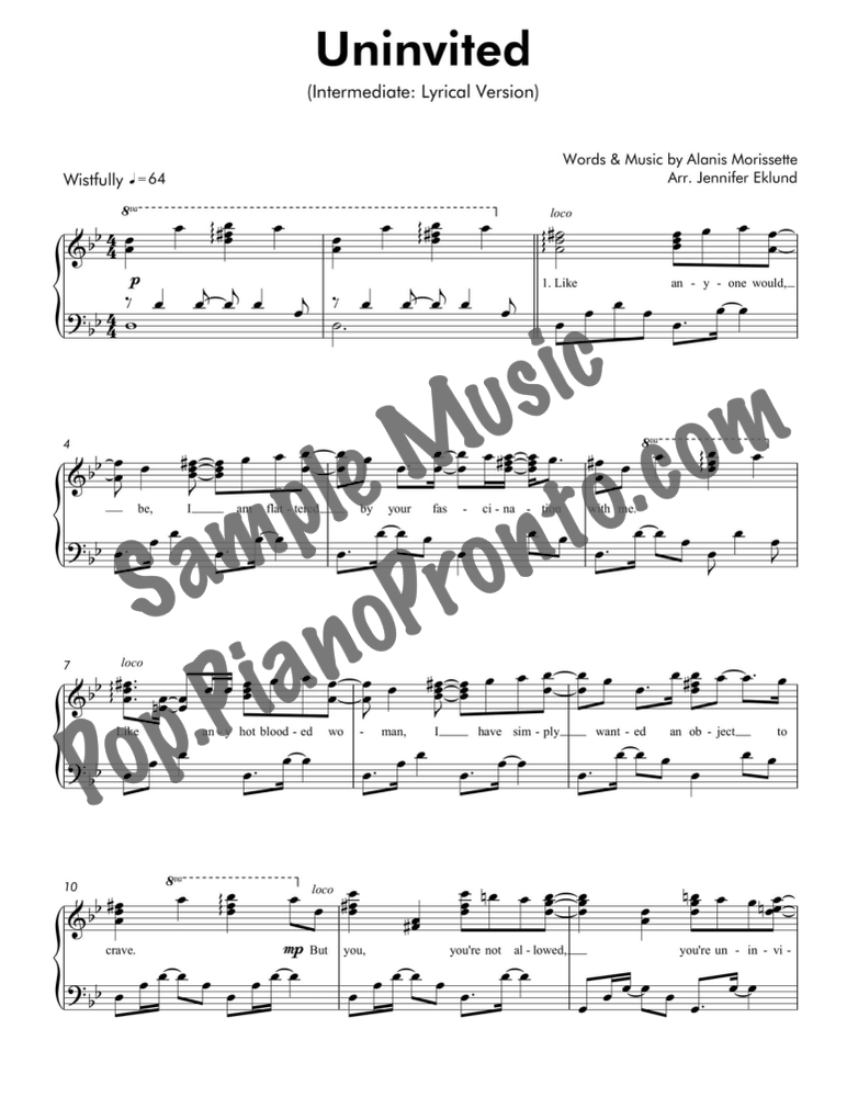 Uninvited, as performed by Alanis Morissette, set here as a sparkling lyrical piano solo for intermediates by Jennifer Eklund. This version has the vocal range set higher.