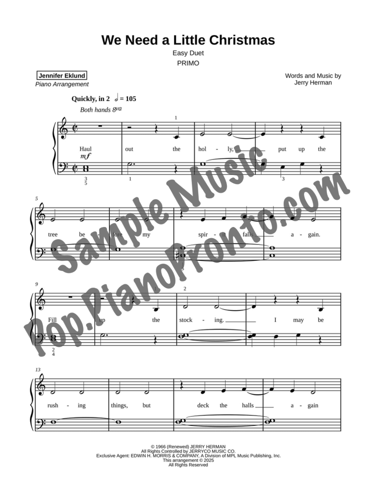 We Need a Little Christmas, a jovial upbeat holiday favorite, stylishly arranged as an evenly-leveled piano duet for late beginners and early intermediates by Jennifer Eklund.