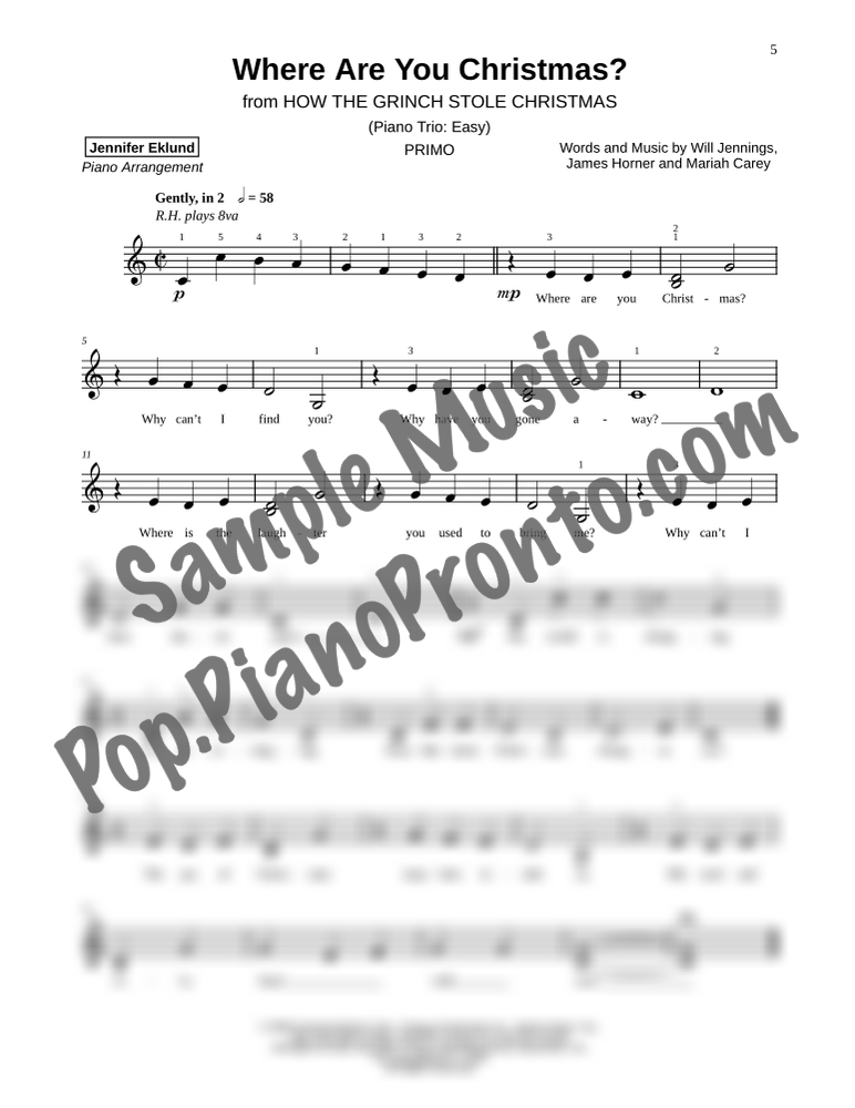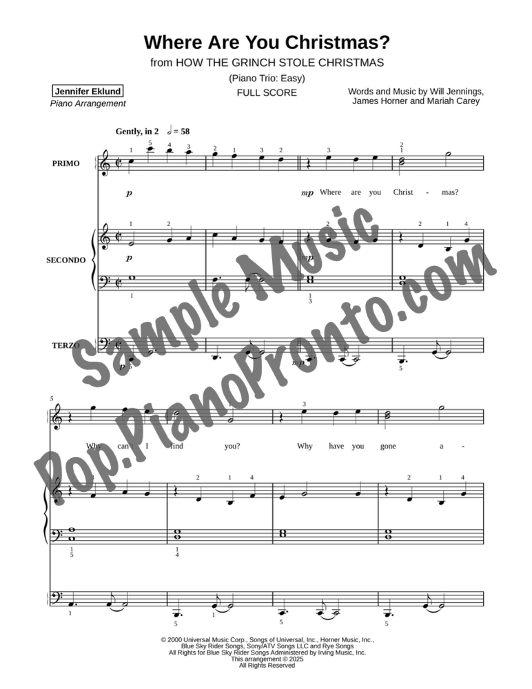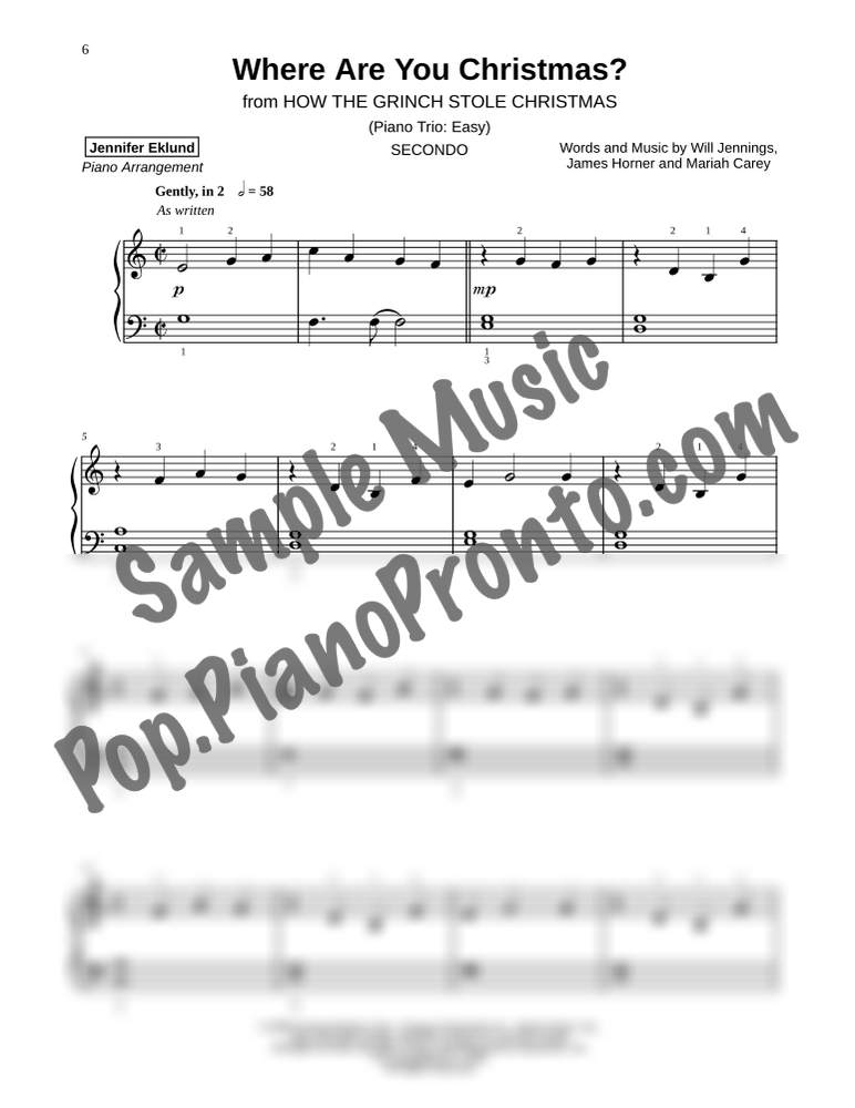 Where Are You Christmas?, a whimsical holiday ballad from "How the Grinch Stole Christmas,", stylishly arranged as an easy trio for late beginners and early intermediates by Jennifer Eklund. This ensemble piece serves as a great introduction to easy collaborative playing and will also be effective in group piano settings with multiple keyboards. Purchase includes separated parts and a full conductors score.
