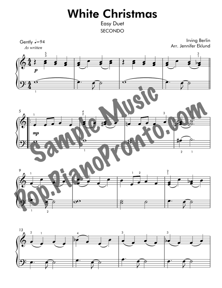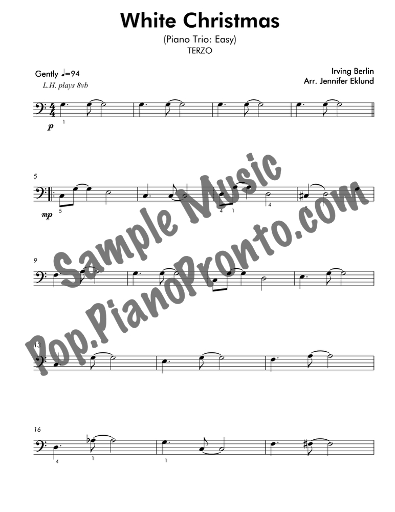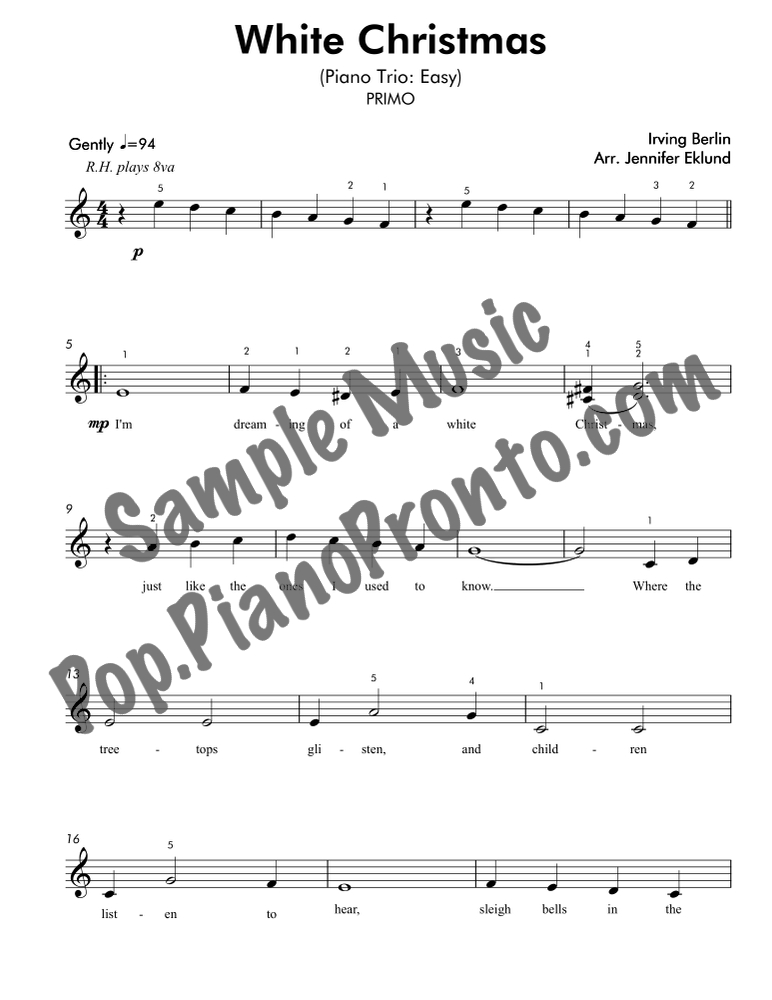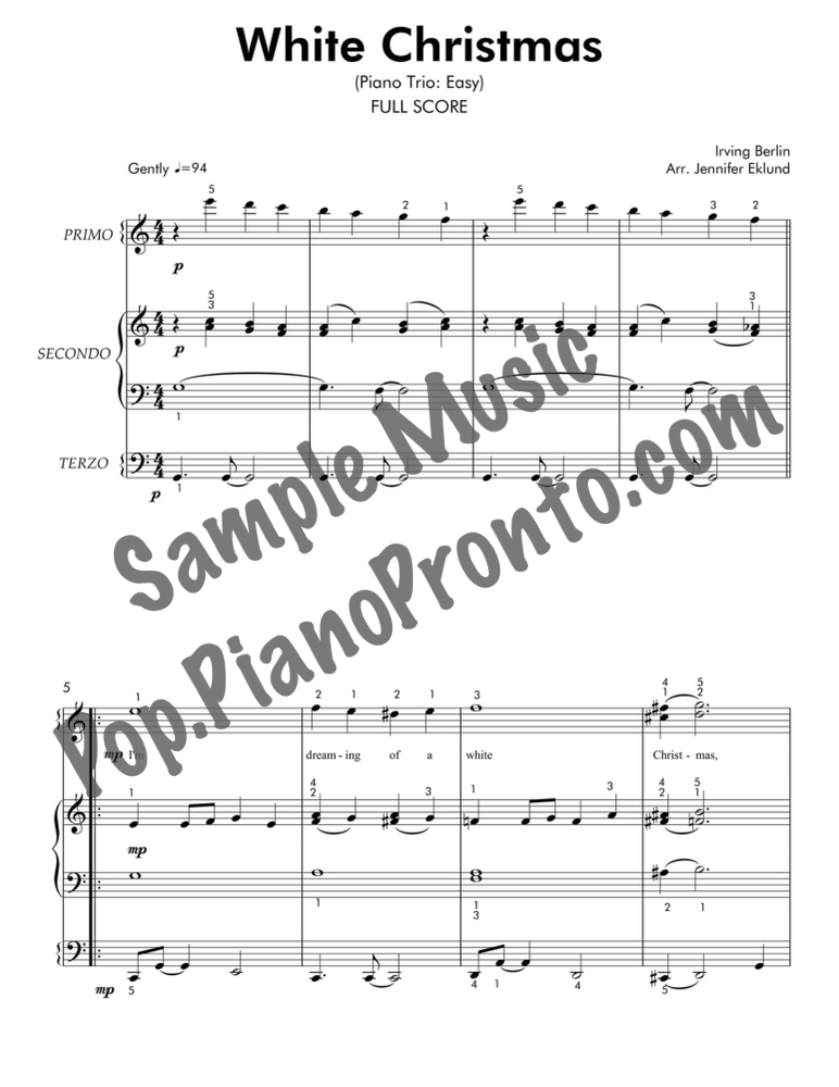 White Christmas, a nostalgic holiday favorite, stylishly arranged as an easy trio for late beginners and early intermediates by Jennifer Eklund. This ensemble piece serves as a great introduction to easy collaborative playing and will also be effective in group piano settings with multiple keyboards. Purchase includes separated parts and a full conductors score.