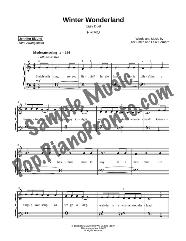 Winter Wonderland, an upbeat holiday favorite, stylishly arranged as an evenly-leveled piano duet for late beginners and early intermediates by Jennifer Eklund.